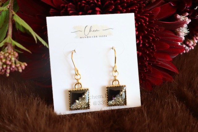 彩添えるアクセサリー . ブラックにゴールドやシルバーのパーツを封入し、大人っぽいデザインに仕上げました。 ひとつひとつ手作りで仕上げていますので、世界にひとつだけのアクセサリーです♩ . さりげなく揺れるデザインは、普段使いにも特別な日にもぴったりなサイズ感◎ スクエアサイズ 約1.3cm×1.0cm サージカルステンレス(SUS316)のピアスパーツ(フック)を使用しておりますので、金属アレルギーの方でも安心してお使いいただけます。 イヤリングタイプやロングタイプ、ボールチェーン追加への変更も可能ですので、お好きなスタイルに合わせてお楽しみください♩ ※ご希望の方はオプションよりお選びください ⚫︎注意事項⚫︎ ・お使いの端末や閲覧環境により、写真と実物の色味や質感が多少異なって見えることがございます。 ・一つ一つ丁寧に作成しておりますが、既製品ほどの強度はありませんので優しくお取り扱い下さい。 ・ハンドメイドですので左右の違い、気泡、小傷、凹凸がある場合がございます。 ・自然素材は経年劣化により徐々に退色していきますが、自然の色味としてお楽しみ頂けると幸いです。