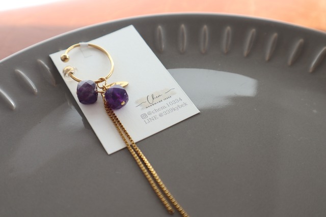 アメジストを使用した、動くたびに重なり揺れるレイヤーデザイン。 天然石とガラスビーズの輝きが存在感を放ちます。 チャームが取り外し可能なので、シンプルにも楽しめます。(サイズ調整可) また、シリコンを外すと指輪としても使用可能な3way仕様です。 . ◎簡単に着脱できて、落ちにくいデザイン。 普段イヤリングが痛い方やお子様でも大丈夫◎ 着けていることを忘れる着け心地です。 . ◎アレルギーが心配な方にもやさしい素材 耳に触れる部分には、医療用にも使われるサージカルステンレスを使用。 丈夫でさびにくく、金属アレルギーの方にも安心してご使用いただけます。 . 一つ一つ手作りしておりますので、同じ商品でも、石の風合いなど、デザインに若干の違いがあります。 . ※バラ売りご希望の方はお問い合わせよりメッセージをお願いします。 ◎アメジスト(2月の誕生石) ・癒しと安眠 ・直感力を高める ・心を落ち着かせる ・家庭円満をサポート イヤーカフ部分:直径約2cm 全長:約6.6cm -素材- イヤーカフ部分: サージカルステンレス(SUS304) 24KGPメッキ、ニッケルフリー加工 その他パーツ: ・サージカルステンレス(SUS316) ・真鍮+K16GP鍍金 ⚫︎注意事項⚫︎ ・天然石のため、色や形には個体差がございます。 ・強く引っ張ったりせず、やさしくお取り扱いください。 ・写真と実物の色味は、お使いの端末によって多少異なる場合があります。