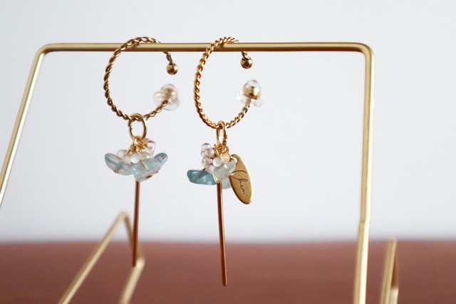 【Amulet - 幸運を呼ぶ天然石イヤーカフ】 涼しげな【アクアマリン】とチェコビーズを合わせた3wayイヤーカフSET。 Chem.オリジナルロゴチャームとゴールドのスティックチャームが耳元で上品に揺れるデザイン。 チャームが取り外し可能なので、シンプルにも楽しめます。 また、シリコンを外すと指輪としても使用可能な3way仕様です。 簡単に着脱できて、落ちにくいデザイン。 普段イヤリングが痛い方やお子様でも大丈夫◎ 着けていることを忘れる着け心地です。 ※バラ売りご希望の方はお問い合わせよりメッセージをお願いします。 ◎アレルギーが心配な方にもやさしい素材 耳に触れる部分には、医療用にも使われるサージカルステンレスを使用。 丈夫でさびにくく、金属アレルギーの方にも安心してご使用いただけます。 アクアマリン(3月誕生石) ・心の癒し、リラックス効果 ・人と人を繋ぎ、調和を促す ・人間関係のトラブル解消 ・幸せな結婚 -サイズ- イヤーカフ部分:直径約2cm 全長:約5.7cm -素材- イヤーカフ部分: サージカルステンレス(SUS304) 24KGPメッキ、ニッケルフリー加工 その他パーツ: ・サージカルステンレス(SUS316) ・真鍮+K16GP鍍金 ⚫︎注意事項⚫︎ ・天然石のため、色や形には個体差がございます。 ・強く引っ張ったりせず、やさしくお取り扱いください。 ・写真と実物の色味は、お使いの端末によって多少異なる場合があります。