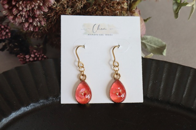 雫・レジン 【コーラルオレンジ×ドライフラワー】くすみ 揺れるゴールドイヤリング・ピアス (金属アレルギー対応)