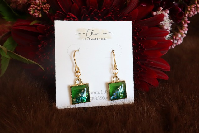 スクエア・レジン【グリーンオーロラ】揺れるゴールドイヤリング・ピアス (金属アレルギー対応)