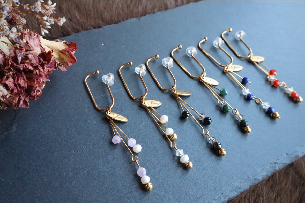 カーネリアンサードオニキスを使用した、動くたびに重なり揺れるレイヤーデザイン。 天然石とガラスビーズの輝きが存在感を放ちます。 イヤーカフの形状をお選びください。 ①U字型イヤーカフ ②C型3wayイヤーカフ ※一つ一つ手作りしておりますので、同じ商品でも石の風合いなど、デザインに若干の違いがあります ★U字型イヤーカフの特徴 ◎着けていることを忘れる、やさしいフィット感 ◎耳の痛みが苦手な方におすすめ ◎イヤリングのように真下に垂れ下がるデザイン ◎耳のくぼみが浅い人や軟骨が柔らかい人など、耳の形状によっては落ちやすい場合もあります ★C型3wayイヤーカフの特徴 ◎落ちにくく痛みが出る方も少ない ◎開き具合が調整できる ◎U字タイプより少し上に着くイメージ ◎3way仕様なのでチャームを取り外し、シンプルに使える&シリコンを外すと指輪としても使えます どちらもアレルギーが心配な方にもやさしい素材 耳に触れる部分には、医療用にも使われるサージカルステンレスを使用。 丈夫でさびにくく、金属アレルギーの方にも安心してご使用いただけます。 ◎カジュアルにも、特別な日にも さりげない華やかさが魅力。普段使いはもちろん、パーティーやお出かけにもぴったり。 どんなコーディネートにも自然になじみます。 ◎カーネリアンサードオニキス(8月の誕生石) ・人間関係とパートナーシップの促進 ・自己成長をサポート ・創造性と表現力向上 ・集中と安定 ・守護の力 サイズ U字タイプ ・イヤーカフ部分:約2cm×1.3cm ・全長:約7.3cm C型3wayタイプ ・イヤーカフ部分:直径約2cm ・全長:約6.6cm