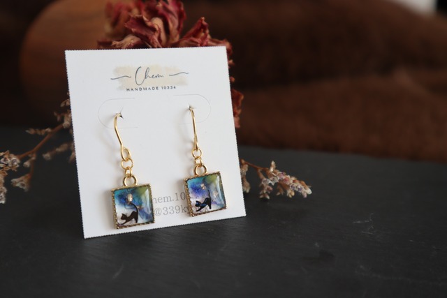 レジンスクエア 夜空 黒ネコ ハロウィン イヤリング・ピアス