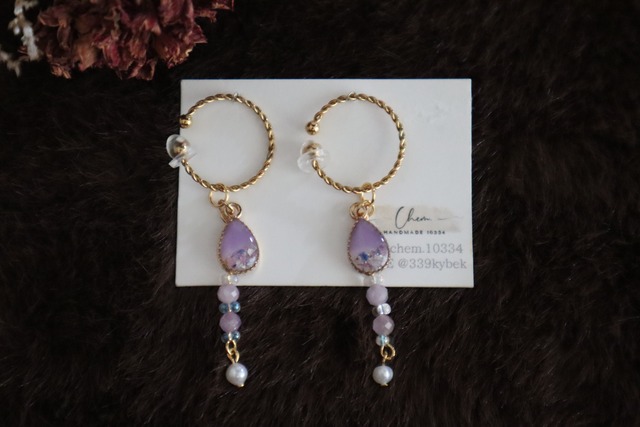 【Amulet - 幸運を呼ぶ天然石イヤーカフ】 ライラック色のくすみカラーの雫にクンツァイトと淡水パールを合わせた2wayイヤーカフSET。 . “Amulet”という名の通り、毎日にそっと寄り添うお守りのようなアクセサリーです。 . たったひとつしかない特別な輝き。 光の加減で表情を変えるブルーのきらめきが、耳元をさりげなく華やかに演出してくれます。 . チャームが取り外し可能なので、シンプルにも楽しめます。 また、シリコンを外すと指輪としても使用可能な3way仕様です。 . ◎簡単に着脱できて、落ちにくいデザイン。 普段イヤリングが痛い方やお子様でも大丈夫◎ 着けていることを忘れる着け心地です。 . ◎アレルギーが心配な方にもやさしい素材 耳に触れる部分には、医療用にも使われるサージカルステンレスを使用。 丈夫でさびにくく、金属アレルギーの方にも安心してご使用いただけます。 . 一つ一つ手作りしておりますので、同じ商品でもラメの入り方など、デザインに若干の違いがあります。 . ※バラ売りご希望の方はお問い合わせよりメッセージをお願いします。 ⭐︎クンツァイト(9月誕生石) ・不安を癒す ・無限の愛 ・心を穏やかにする ◎淡水パール(6月誕生石) ・幸運や品格、魅力を高める ・邪気を払う ・内外面共に女性らしさを得る手助けをする イヤーカフ部分:直径約2cm 全長:約6cm -素材- イヤーカフ部分: サージカルステンレス(SUS304) 24KGPメッキ、ニッケルフリー加工 その他パーツ: ・サージカルステンレス(SUS316) ・真鍮+K16GP鍍金 ⚫︎注意事項⚫︎ ・天然石のため、色や形には個体差がございます。 ・強く引っ張ったりせず、やさしくお取り扱いください。 ・写真と実物の色味は、お使いの端末によって多少異なる場合があります。