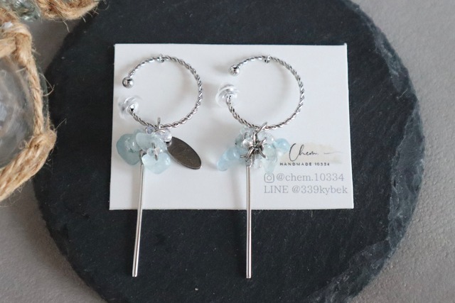 【Amulet - 幸運を呼ぶ天然石イヤーカフ】 涼しげな【アクアマリン】とチェコビーズを合わせた3wayイヤーカフSET。 “Amulet”という名の通り、お守りのようなアクセサリーです。 Chem.オリジナルロゴチャームとシルバーのスティックチャームが耳元で上品に揺れるデザイン。 チャームが取り外し可能なので、シンプルにも楽しめます。 また、シリコンを外すと指輪としても使用可能な3way仕様です。 簡単に着脱できて、落ちにくいデザイン。 普段イヤリングが痛い方やお子様でも大丈夫◎ 着けていることを忘れる着け心地です。 ※バラ売りご希望の方はお問い合わせよりメッセージをお願いします。 ◎アレルギーが心配な方にもやさしい素材 耳に触れる部分には、医療用にも使われるサージカルステンレスを使用。 丈夫でさびにくく、金属アレルギーの方にも安心してご使用いただけます。 アクアマリン(3月誕生石) ・心の癒し、リラックス効果 ・人と人を繋ぎ、調和を促す ・人間関係のトラブル解消 ・幸せな結婚 -サイズ- イヤーカフ部分:直径約2cm 全長:約6cm -素材- イヤーカフ部分: サージカルステンレス(SUS304) 本ロジウム、ニッケルフリー加工 その他パーツ: ・サージカルステンレス(SUS316) ・真鍮+本ロジウム鍍金 ⚫︎注意事項⚫︎ ・天然石のため、色や形には個体差がございます。 ・強く引っ張ったりせず、やさしくお取り扱いください。 ・写真と実物の色味は、お使いの端末によって多少異なる場合があります。