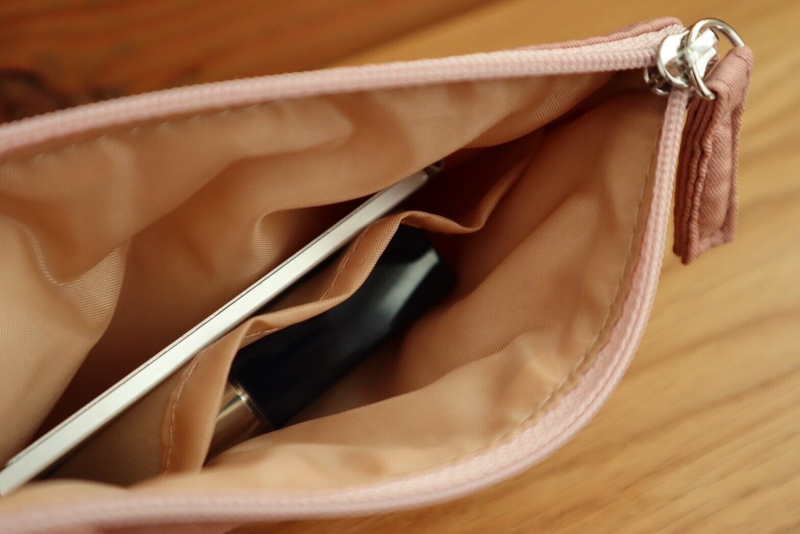 包むのオリジナル雑貨ブランド「ATELIER tsutsumu(アトリエ包む)」のサステナブルな素材を使用したミニポーチです。