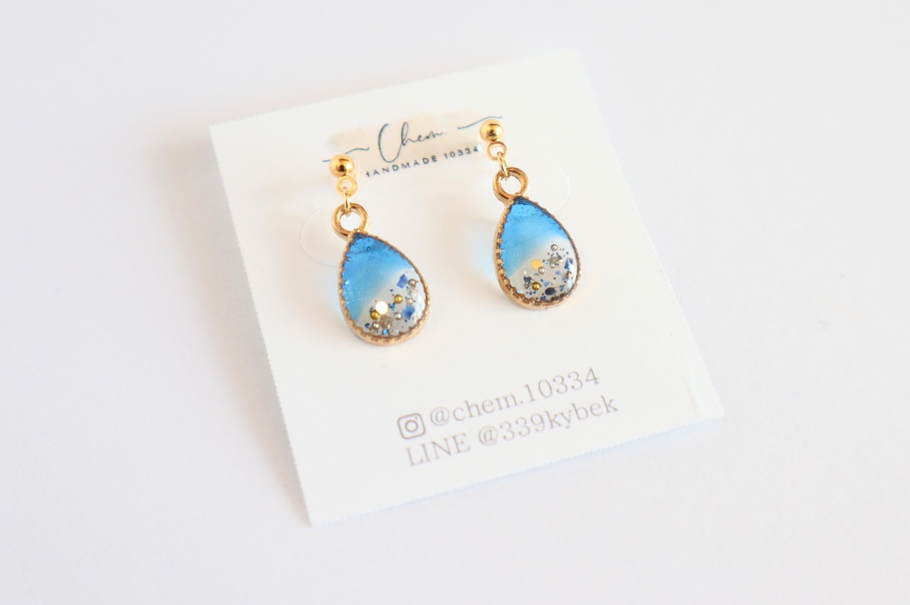 キラキラと輝くゴールドやシルバーのラメを封入した雫型イヤリング・ピアスです。