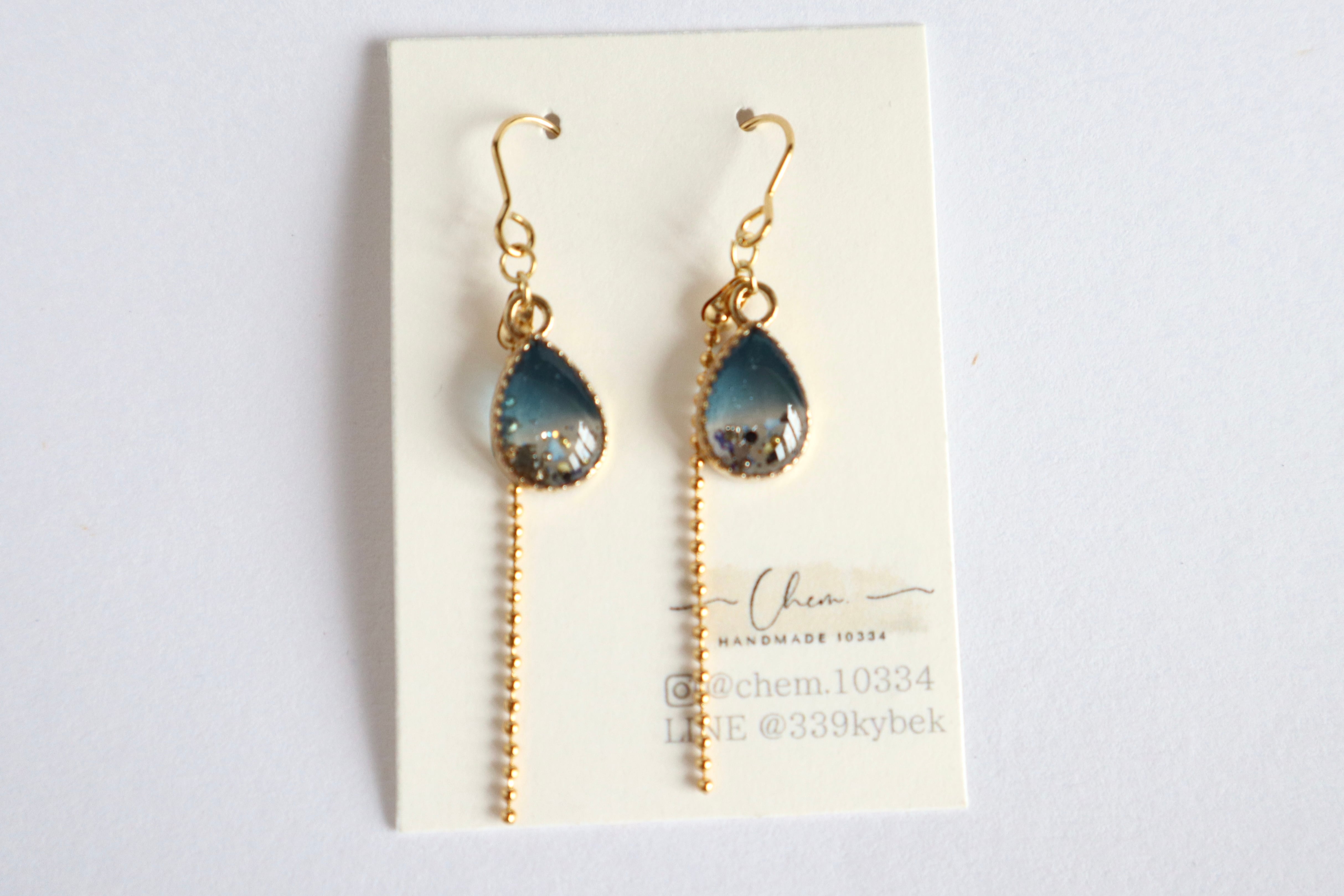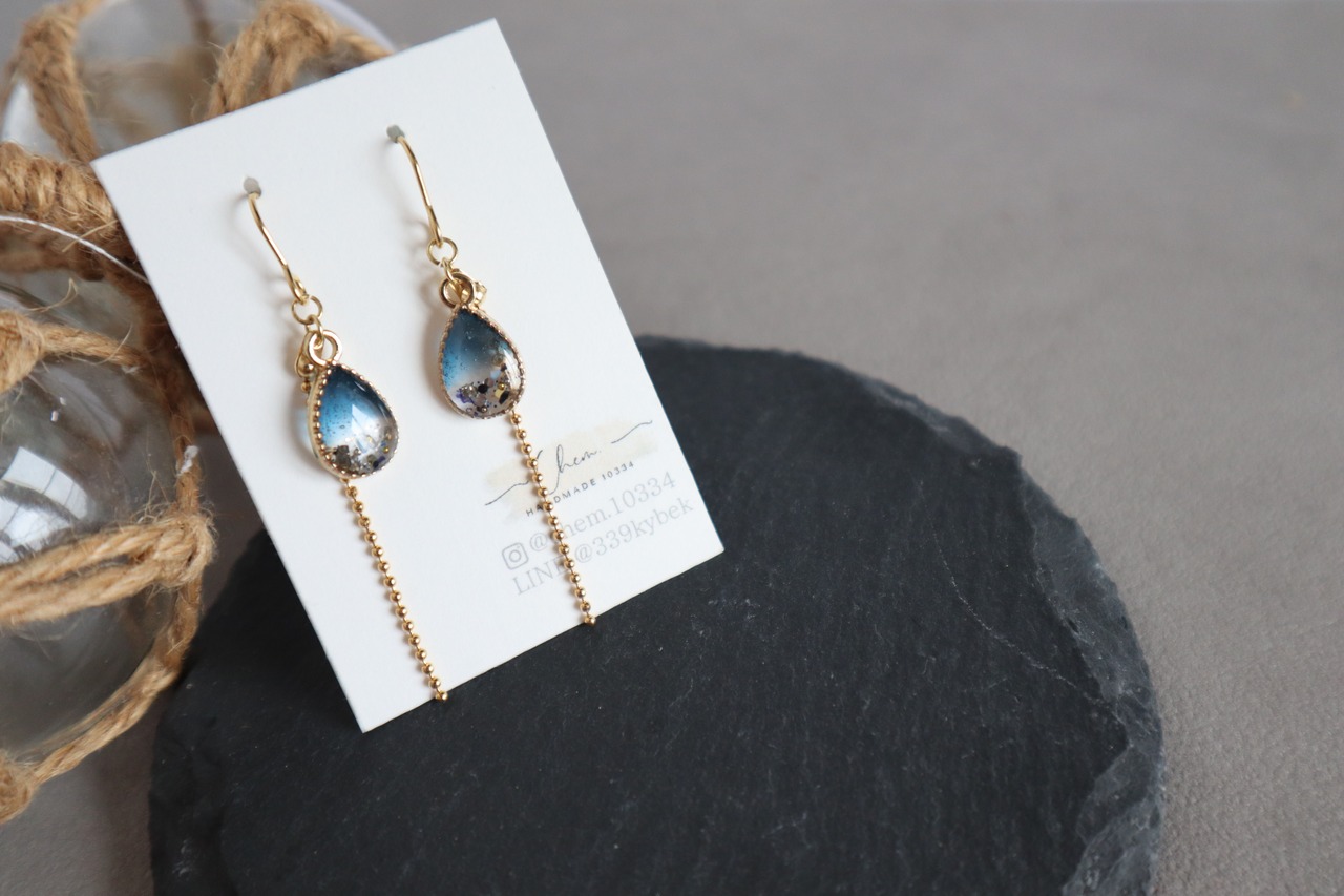 雫型【ダークブルーハーフ】ボールチェーン付きゴールドイヤリング・ピアス (金属アレルギー対応)