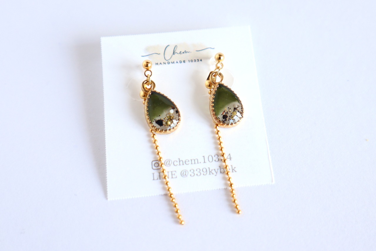 落ち着いたモスグリーンに、キラキラと輝くゴールドやシルバーのラメを封入した雫型イヤリング・ピアスです。