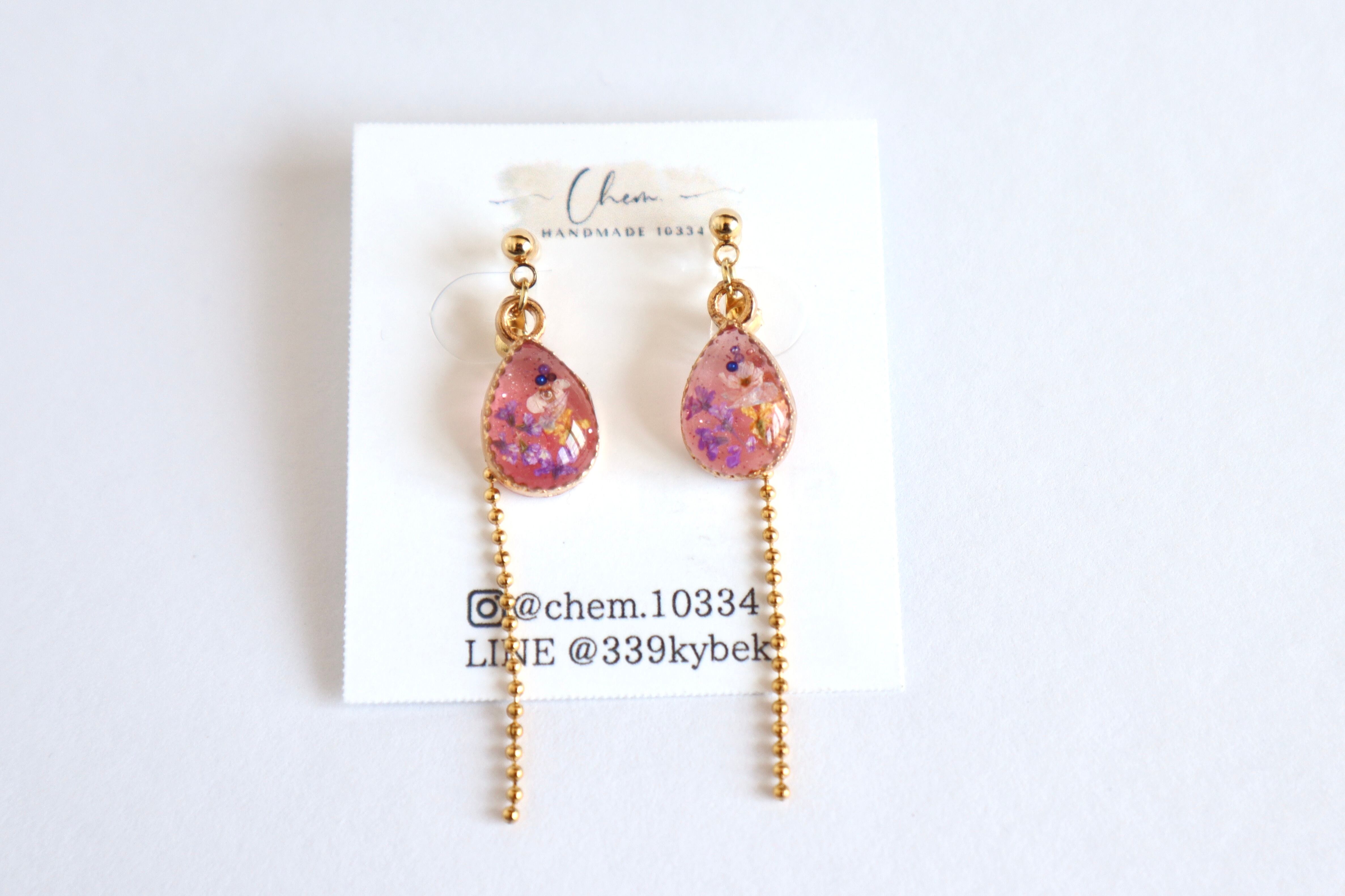 ドライフラワーを使った雫型イヤリング・ピアスです。