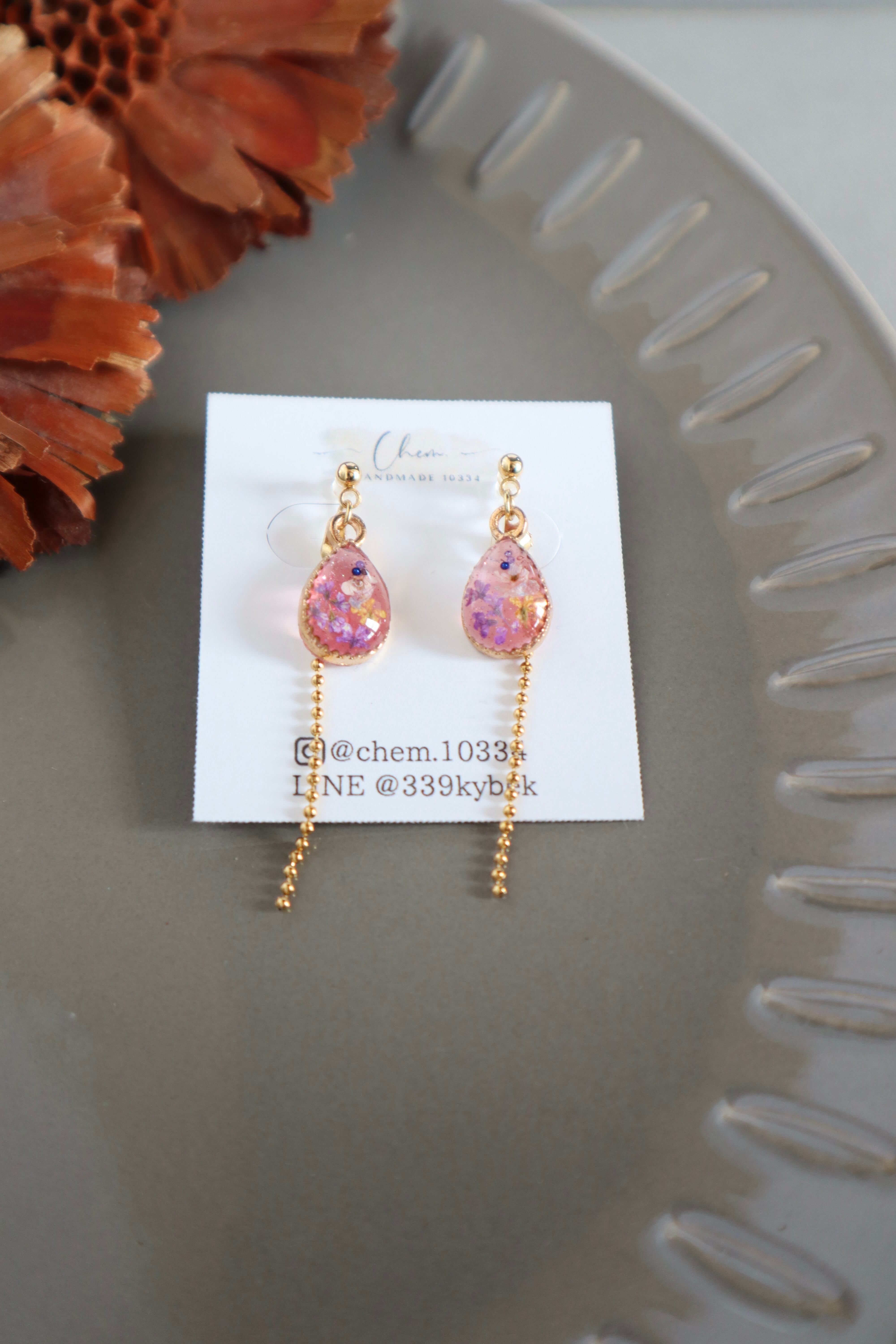 雫型【透明ピンク・花(Fleur)】ボールチェーン付き ゴールドイヤリング・ピアス (金属アレルギー対応)