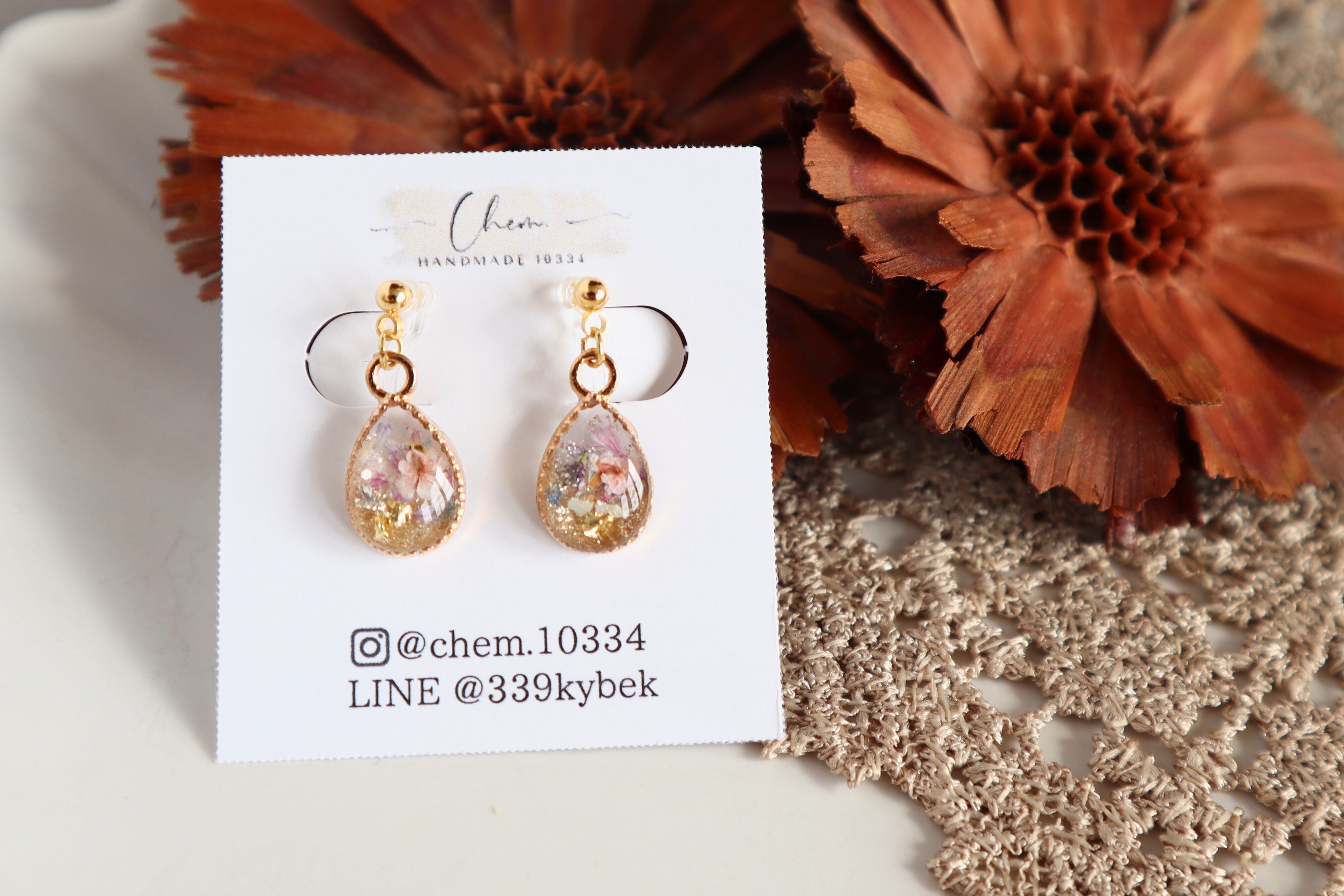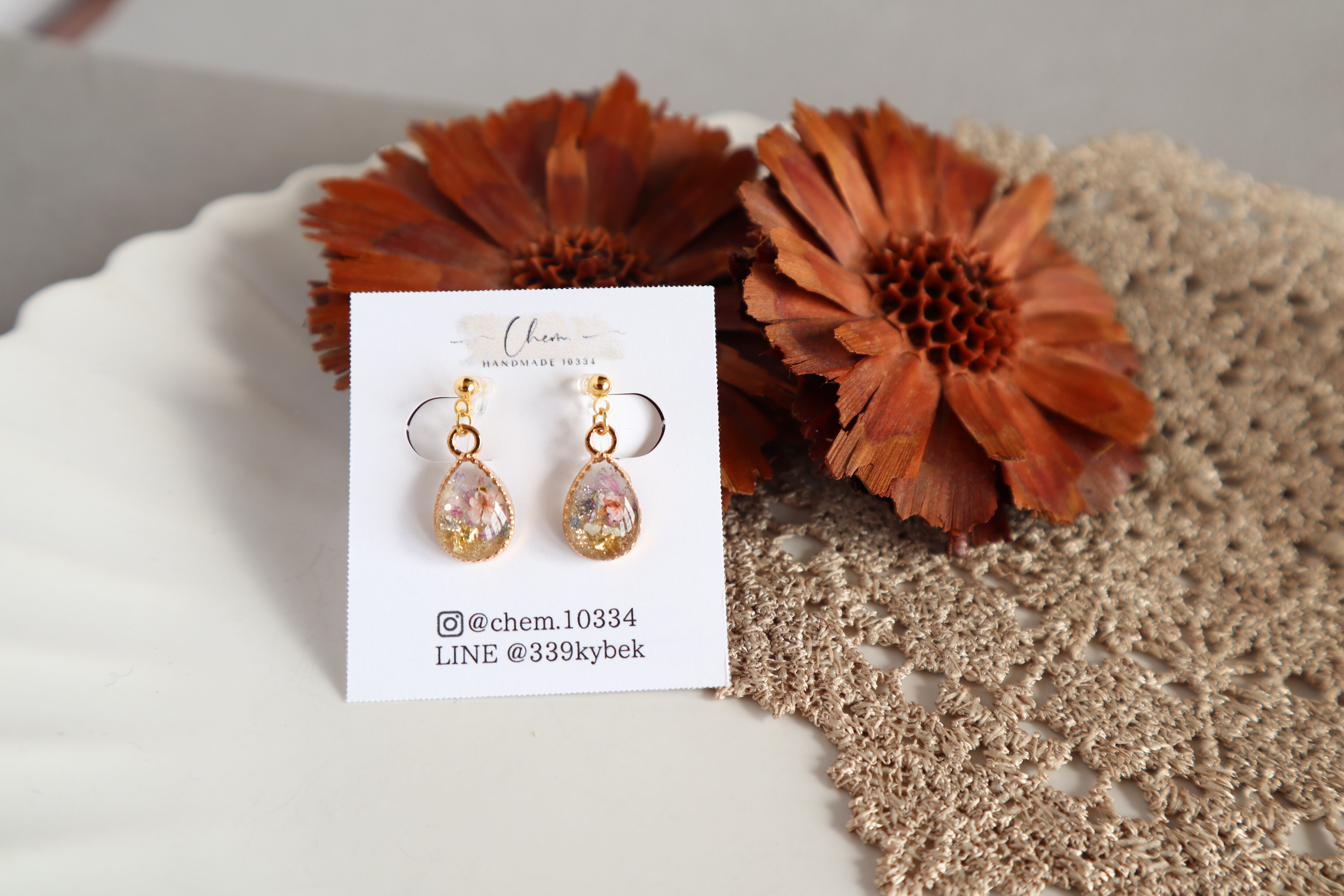 雫型【透明・花(Fleur)】ゴールドイヤリング・ピアス (金属アレルギー対応)