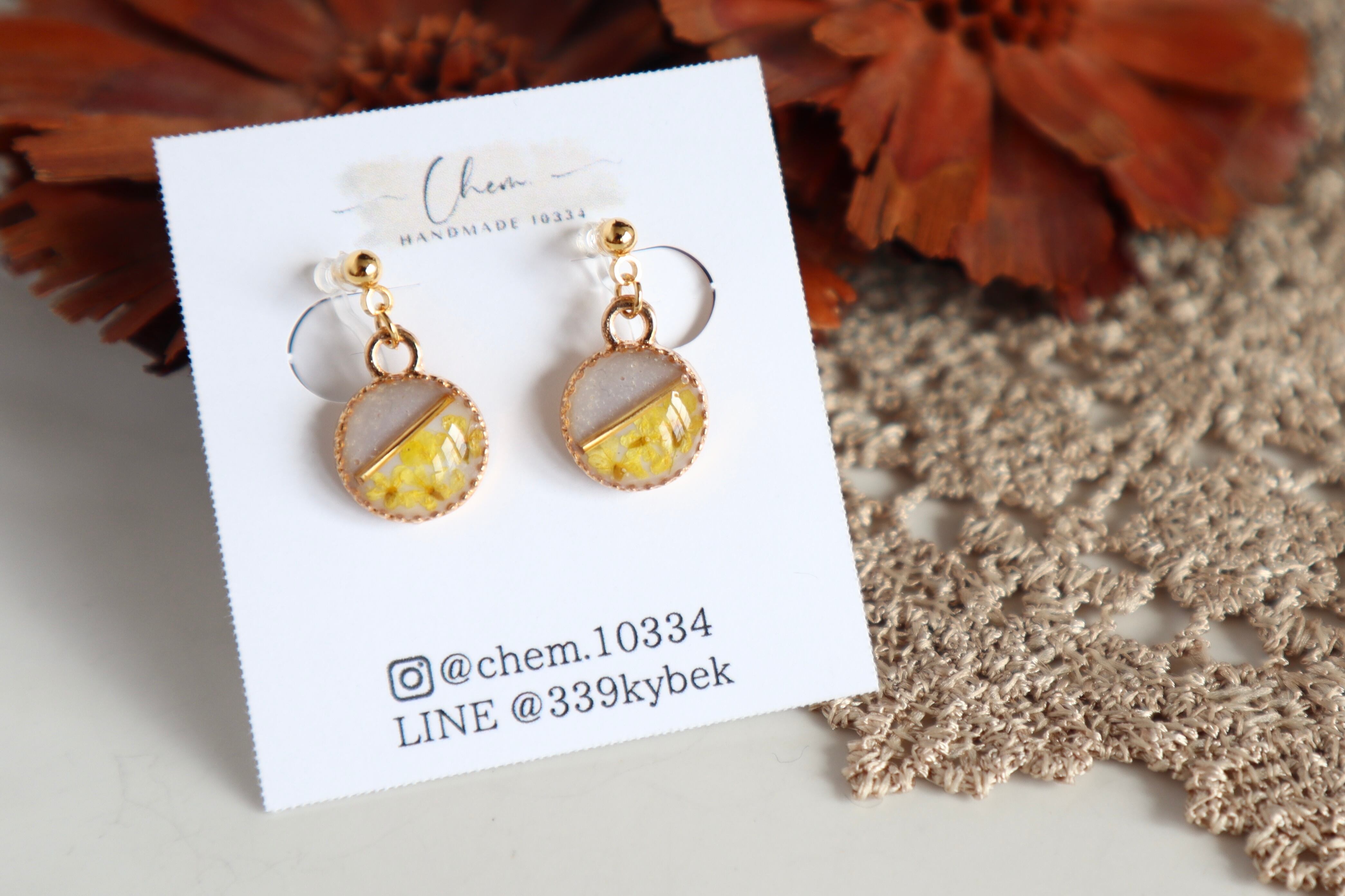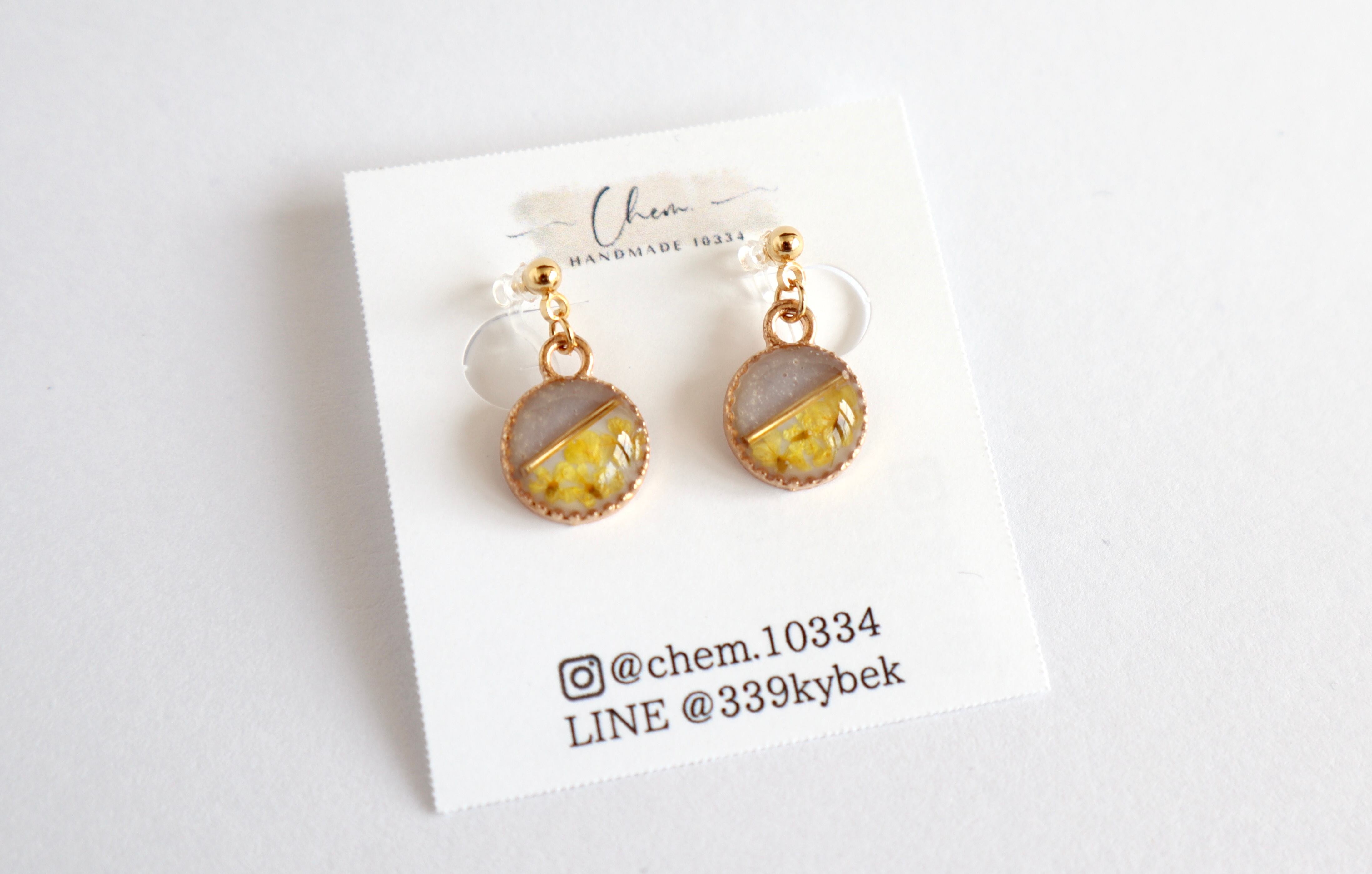 円型【ラベンダーグレー・イエローハーフ・花(Fleur)】ゴールドイヤリング・ピアス (金属アレルギー対応)