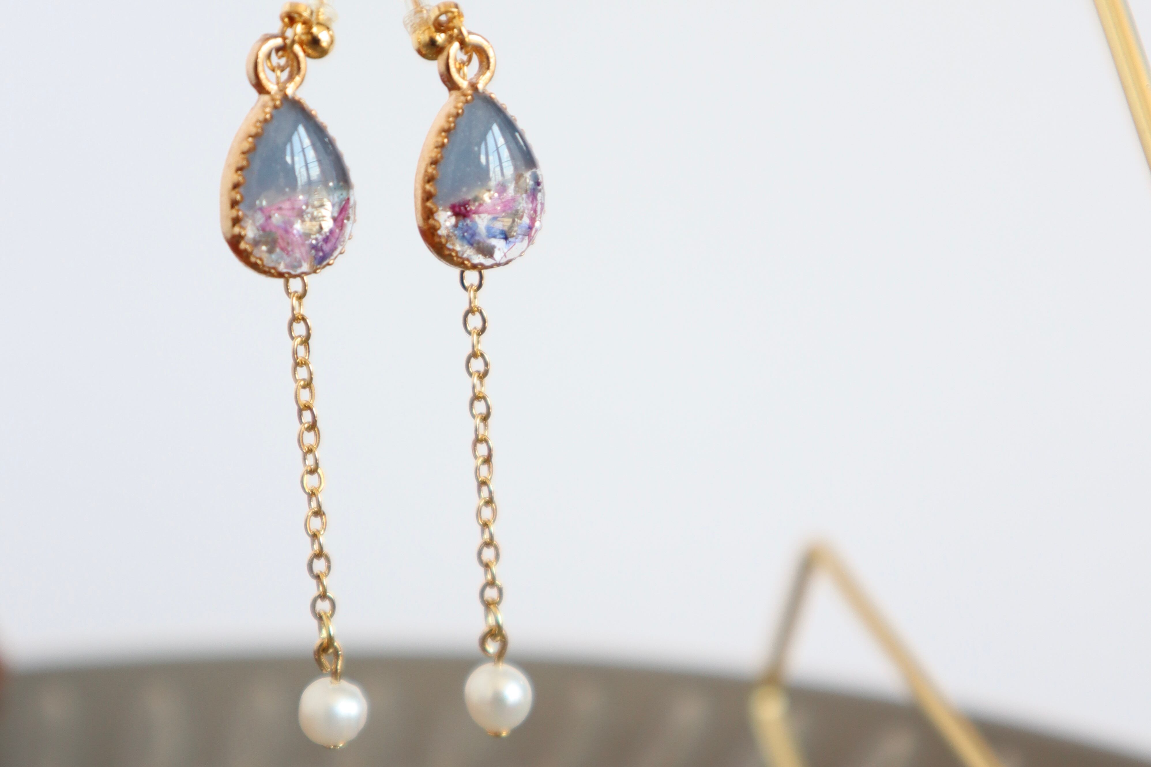 雫型【くすみブルーハーフ・花(Fleur)】淡水パールチェーン ゴールドイヤリング・ピアス (金属アレルギー対応)