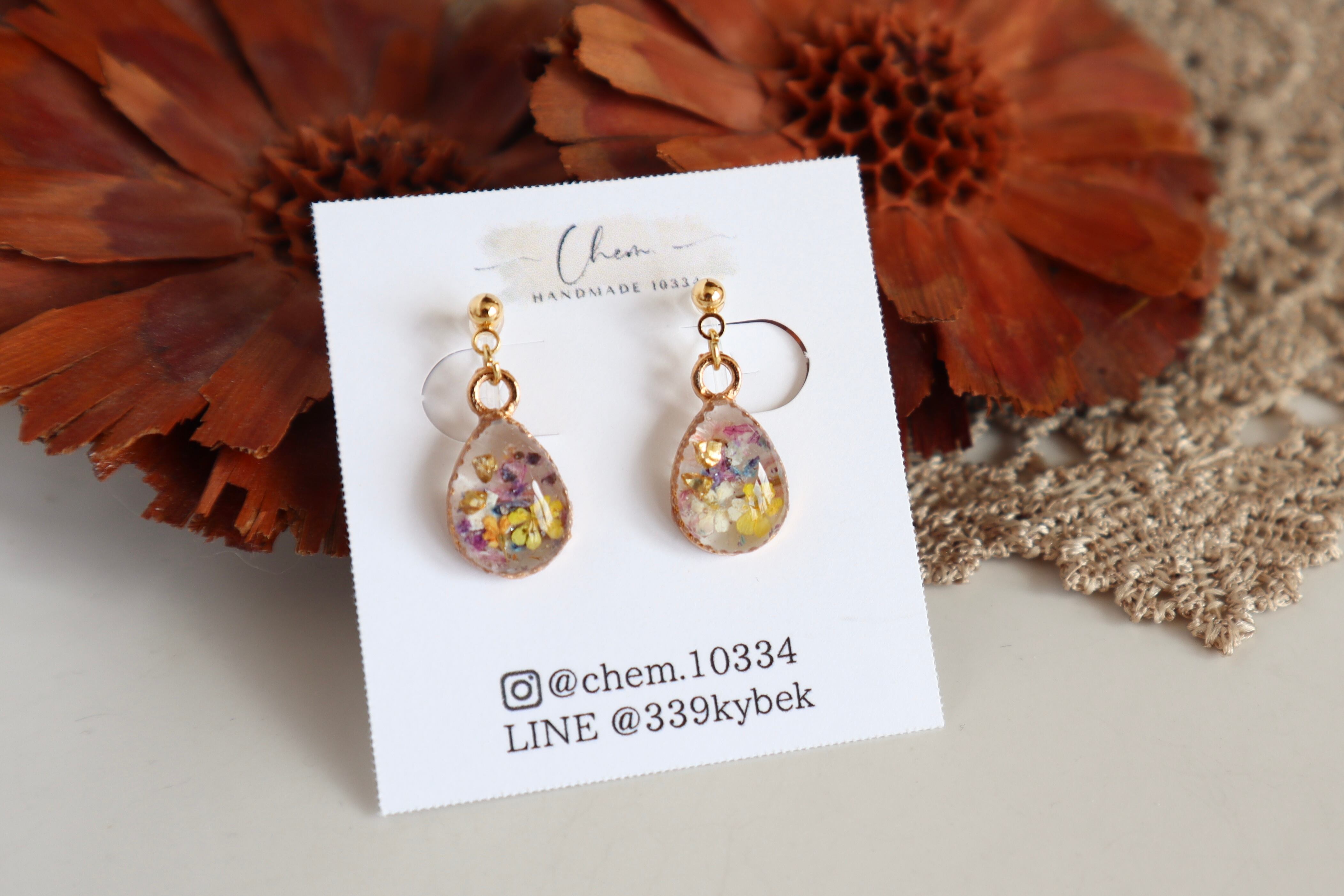 雫型【透明・花(Fleur)】ゴールドイヤリング・ピアス (金属アレルギー対応)
