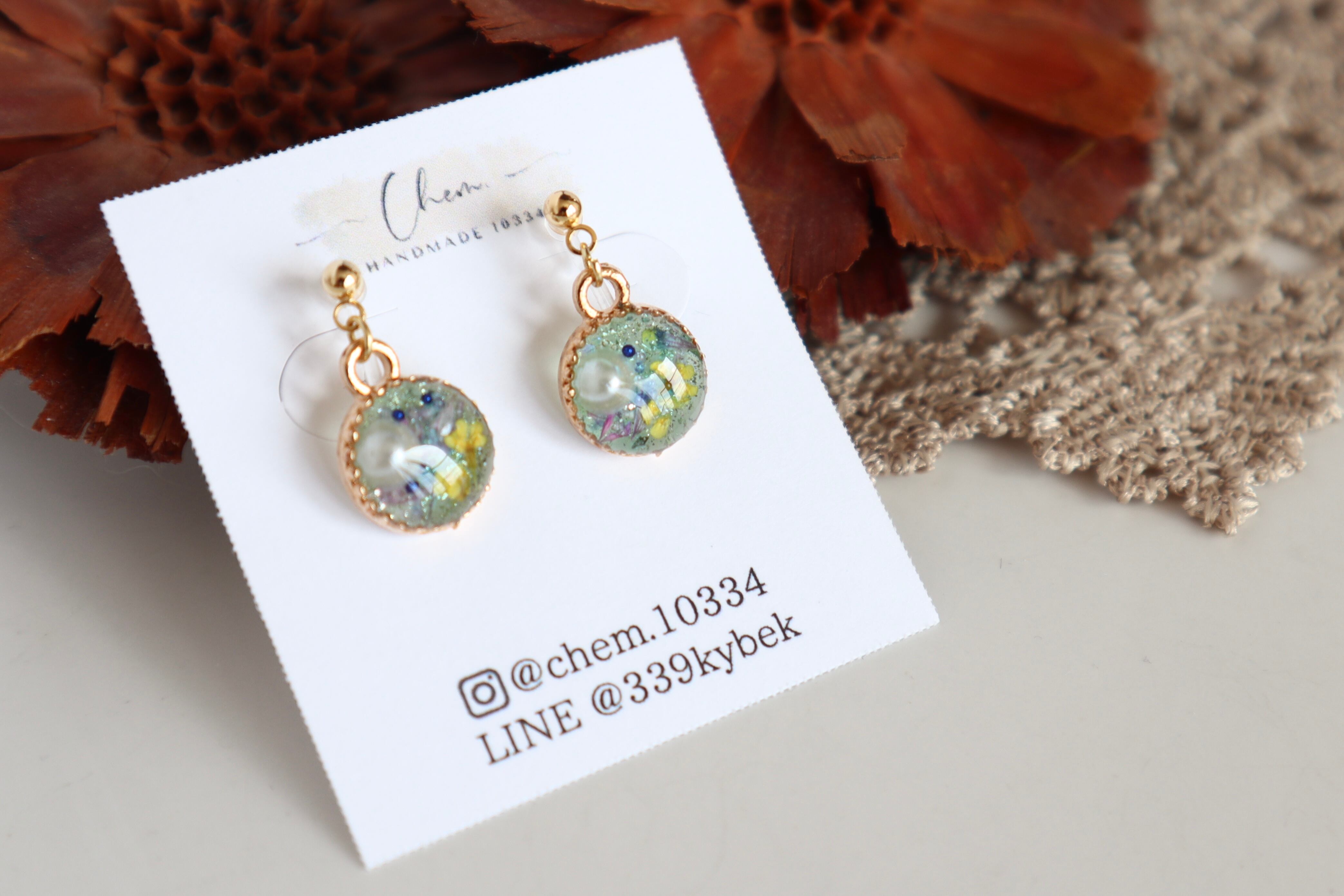 クリアグリーンのレジンにラメとパールを封入し、光を受けてキラキラと輝きます。