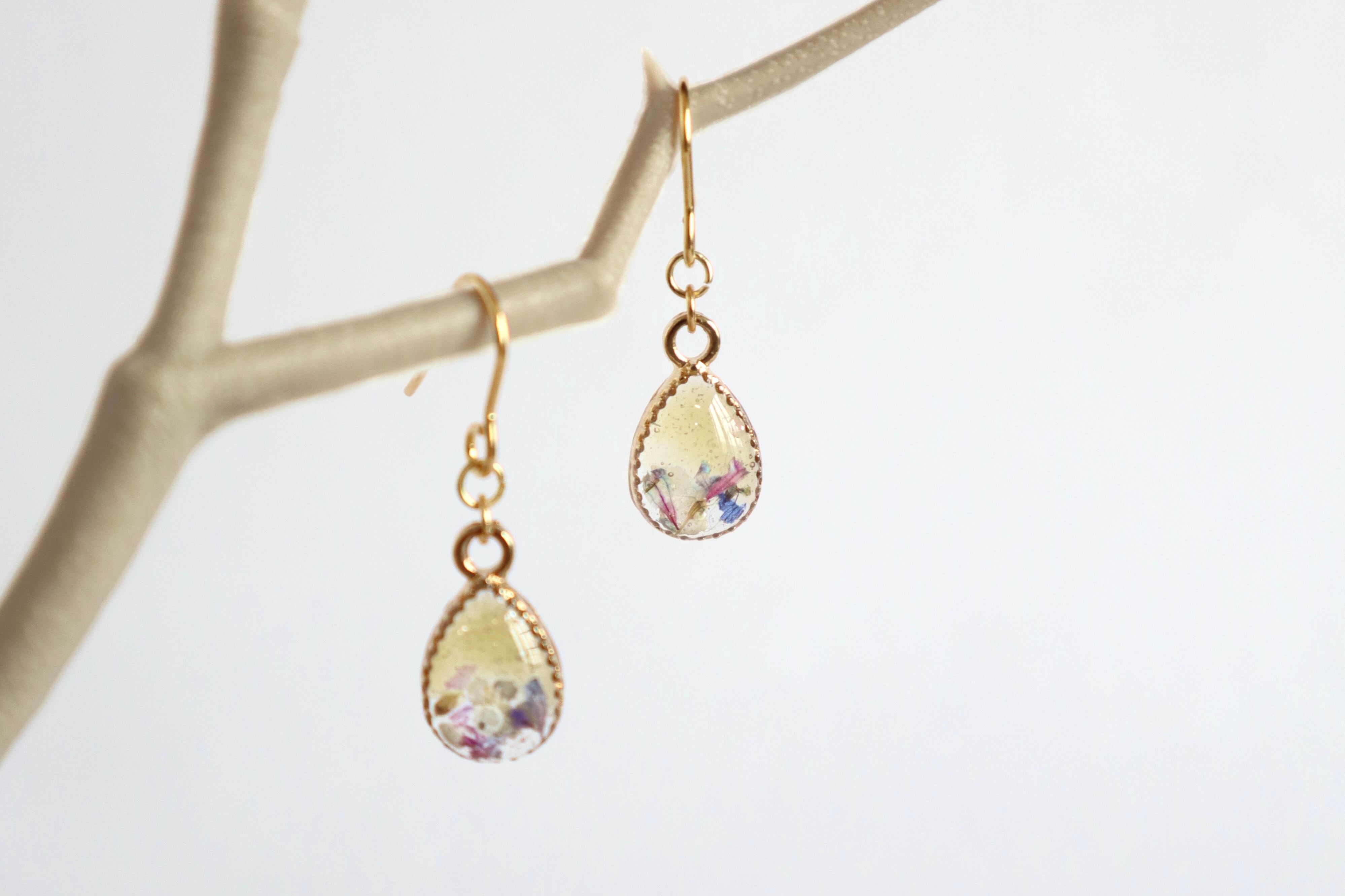 雫型【イエローハーフ・花(Fleur)】ゴールドイヤリング・ピアス (金属アレルギー対応)