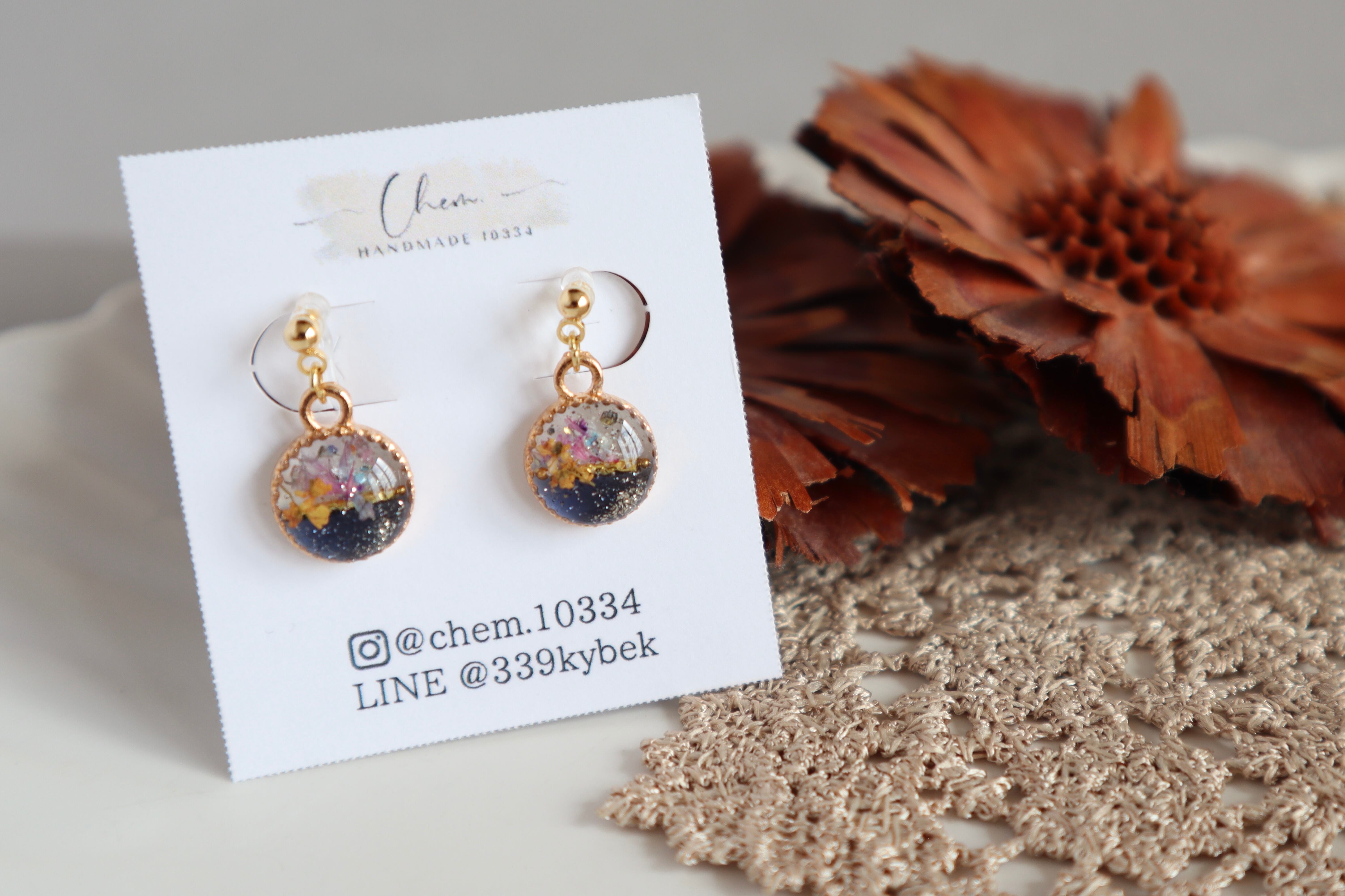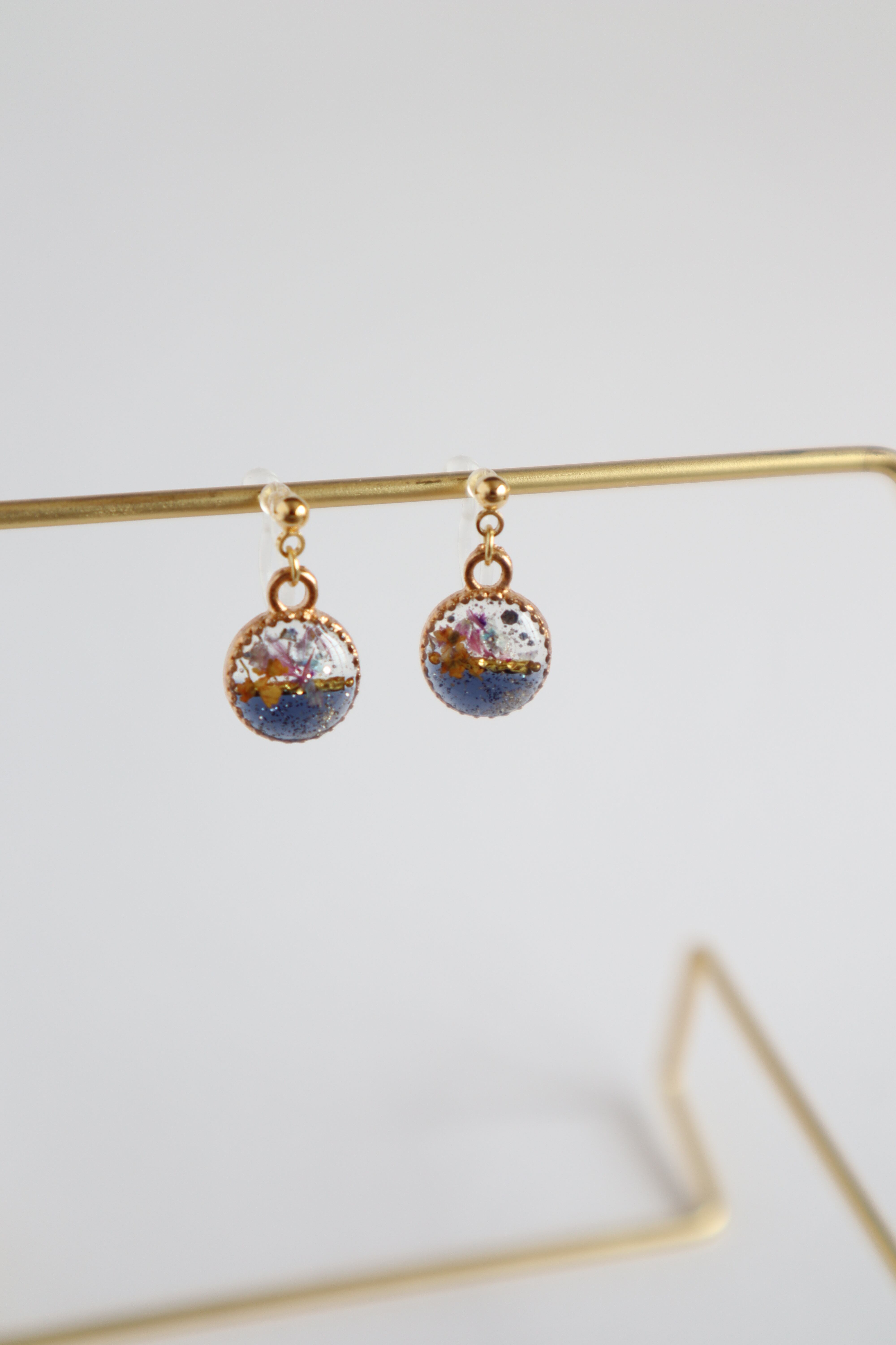 円型【ネイビーハーフ・花(Fleur)】ゴールドイヤリング・ピアス (金属アレルギー対応)
