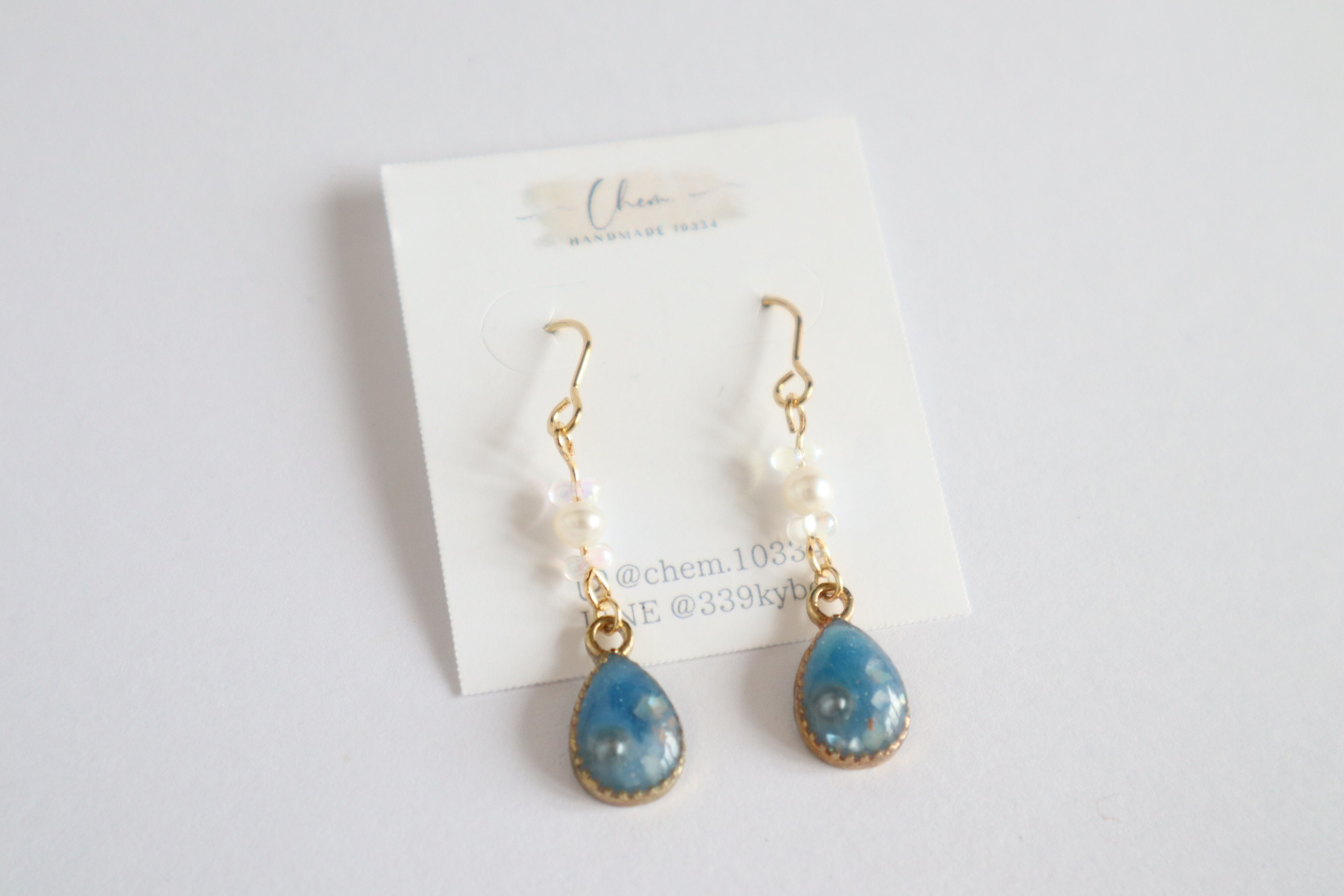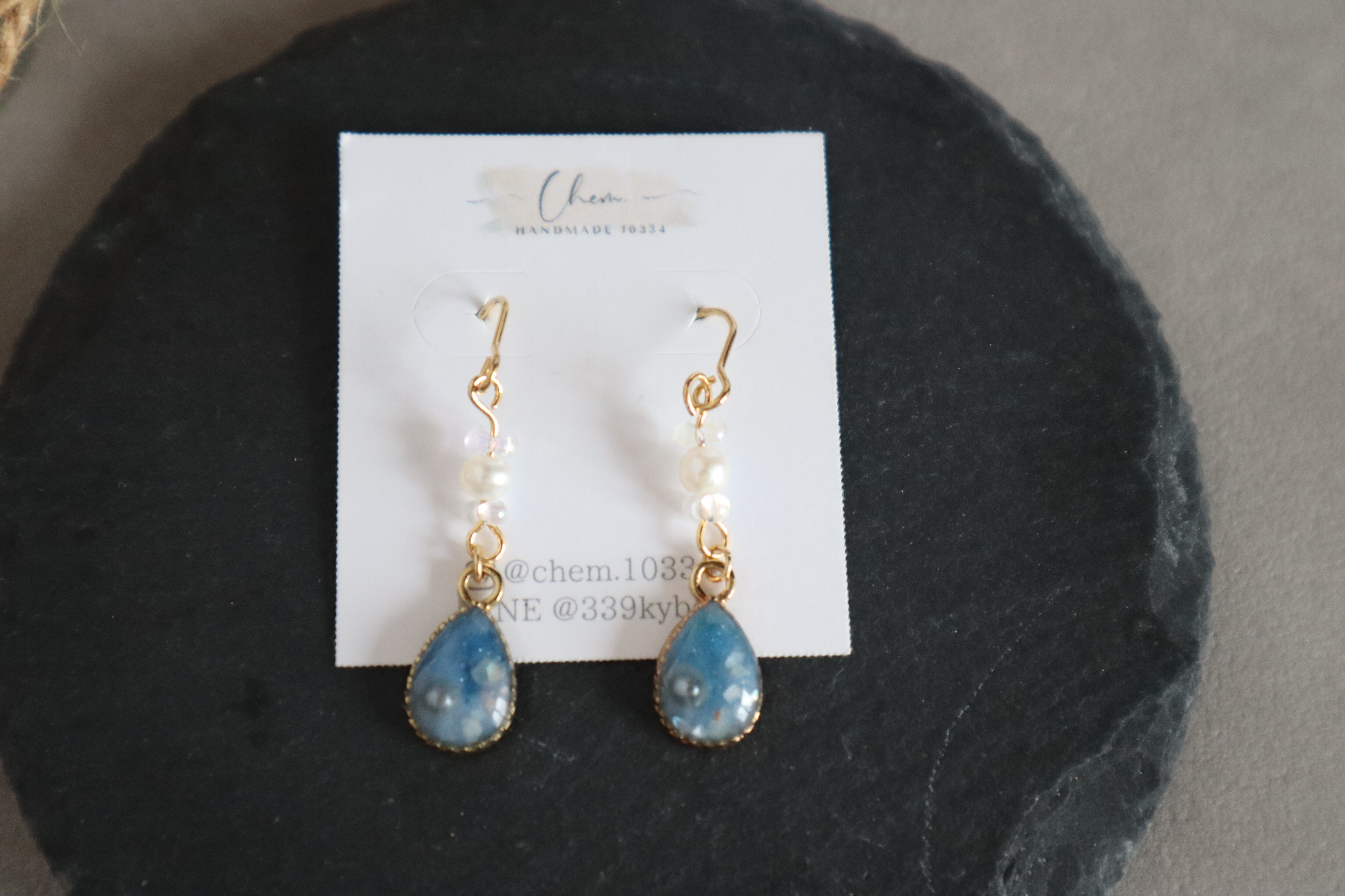 人口パールとシェルを封入し、晴天の空をイメージした雫に淡水パールとチェコビーズを合わせたイヤリング・ピアスです。