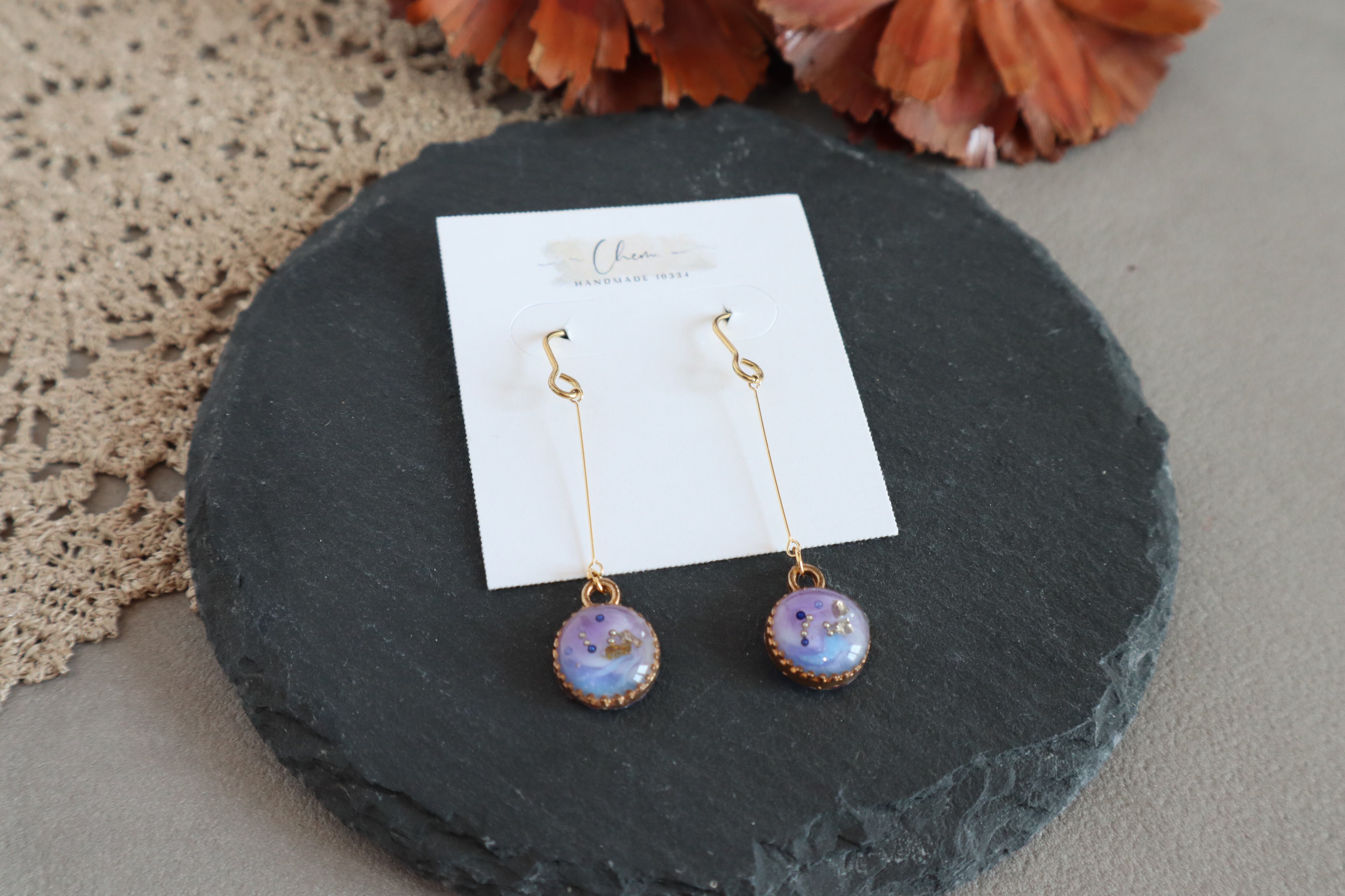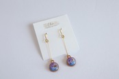 ブルー、紫、白のマーブルデザインが特徴的な円型ロングタイプのイヤリング・ピアスです。