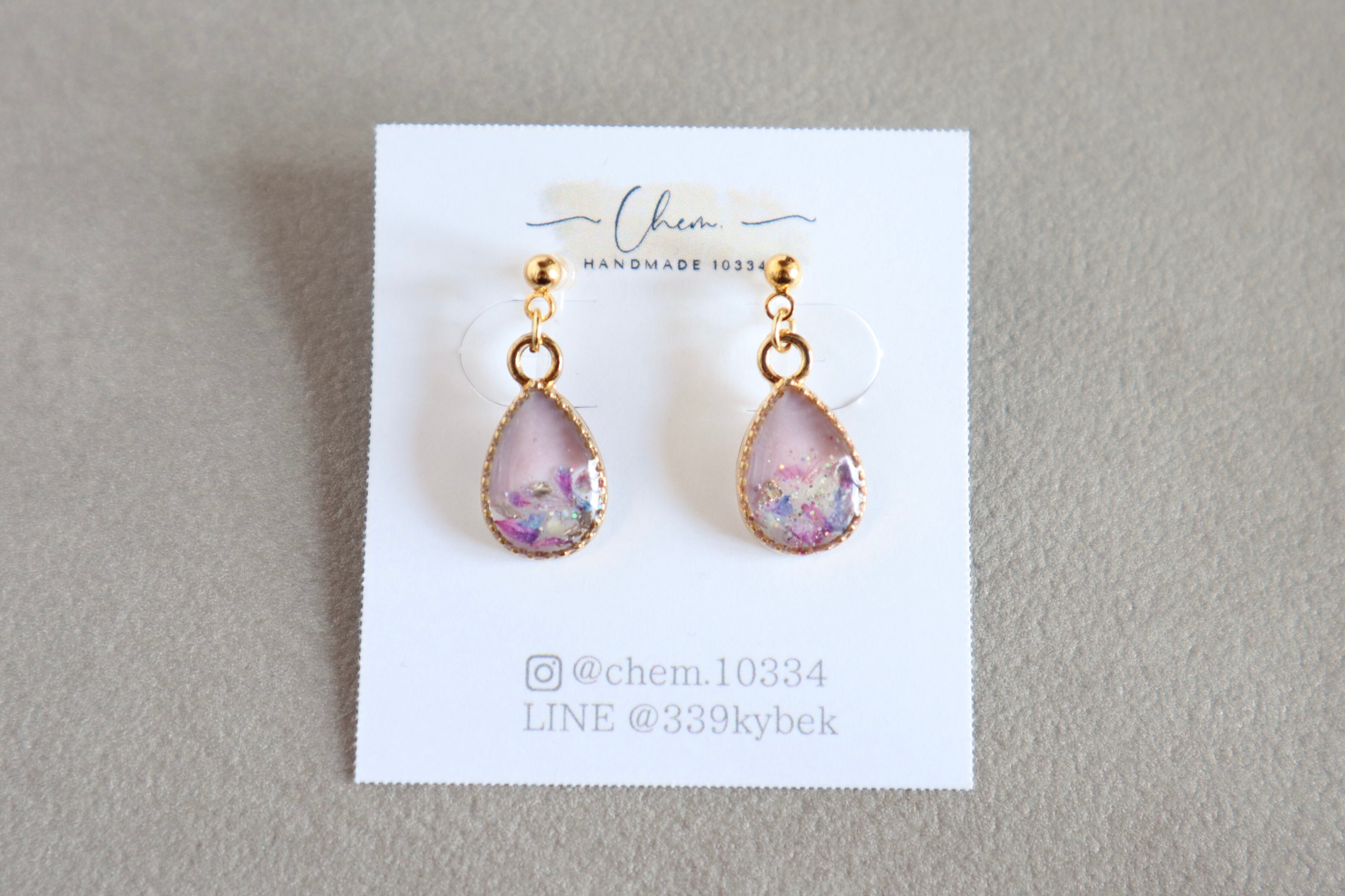 『Fleur(花)フルールシリーズ』ラベンダーピンクとドライフラワーを使ったハーフデザインの雫型イヤリング・ピアスです。