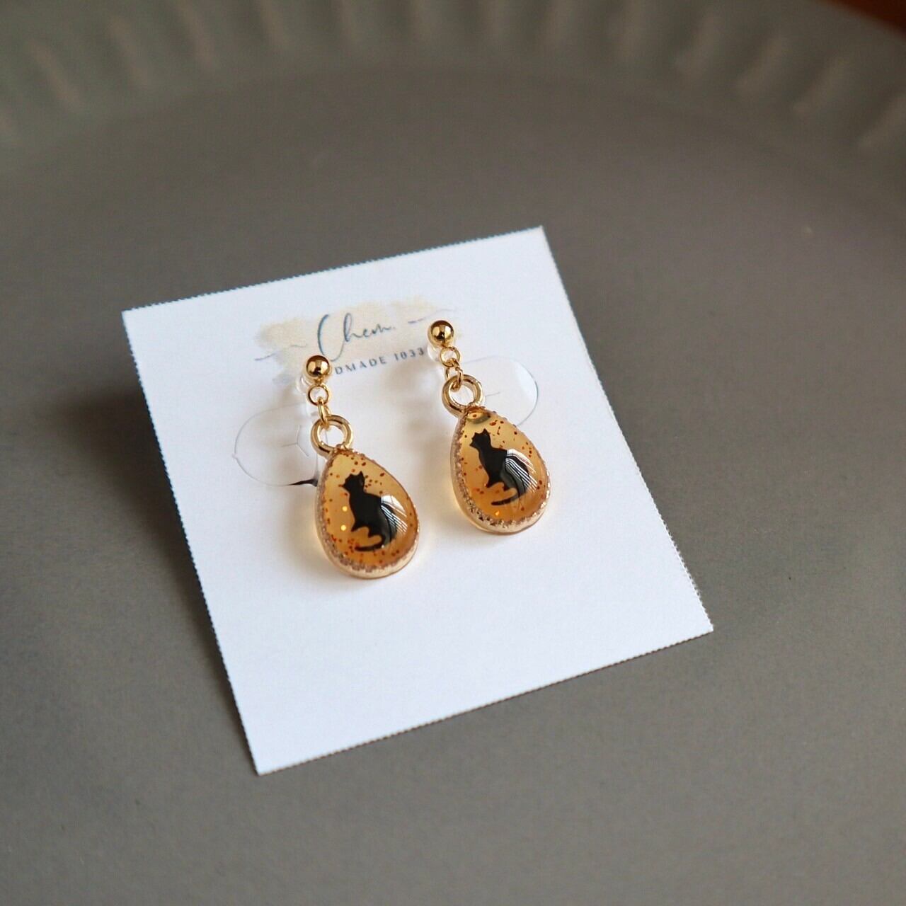 雫型【ネコ×オレンジ】ゴールドイヤリング・ピアス(金属アレルギー対応)