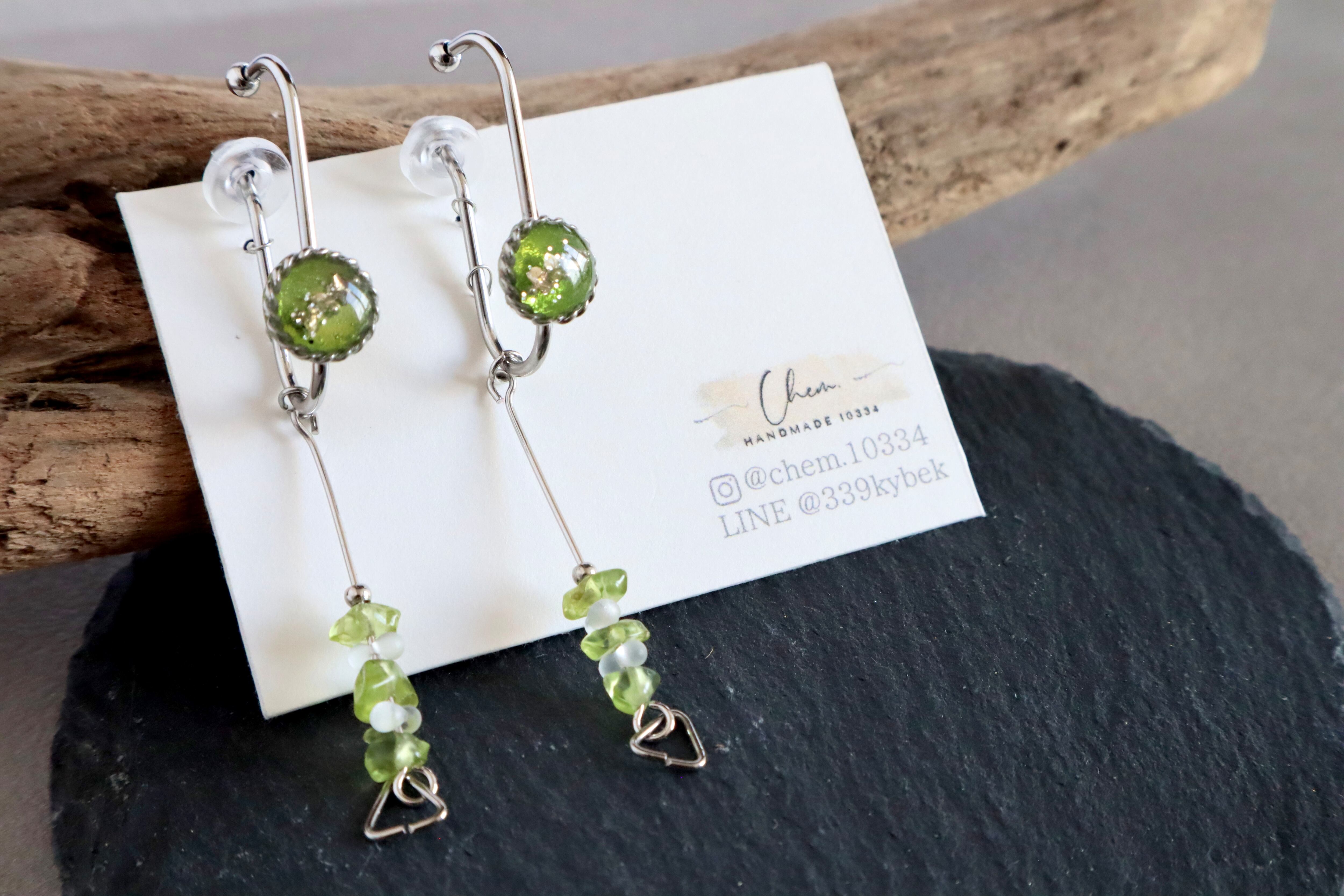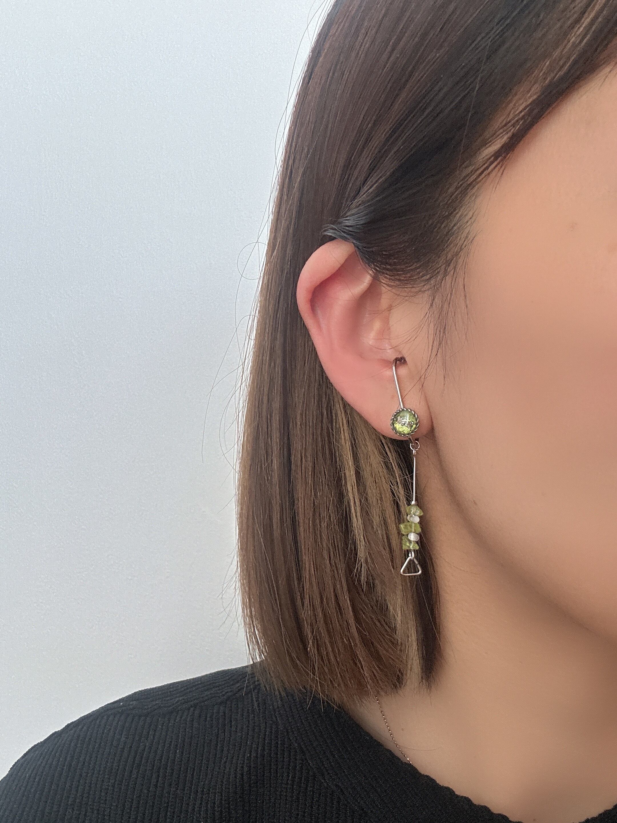 透明感ある黄緑色のレジンに閉じ込めたきらめきと、爽やかな『ペリドット』が耳元で存在感を放つイヤーカフ。