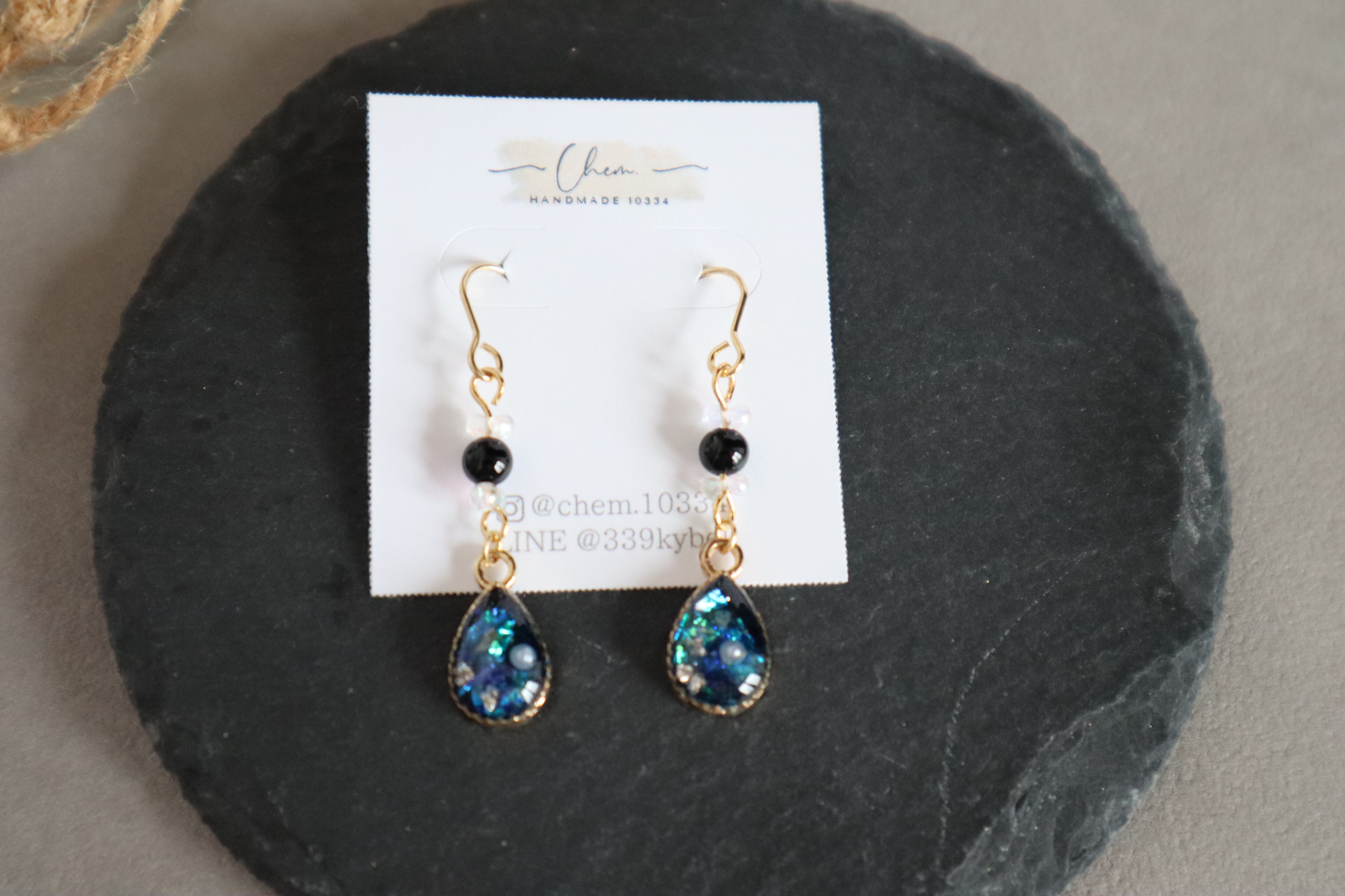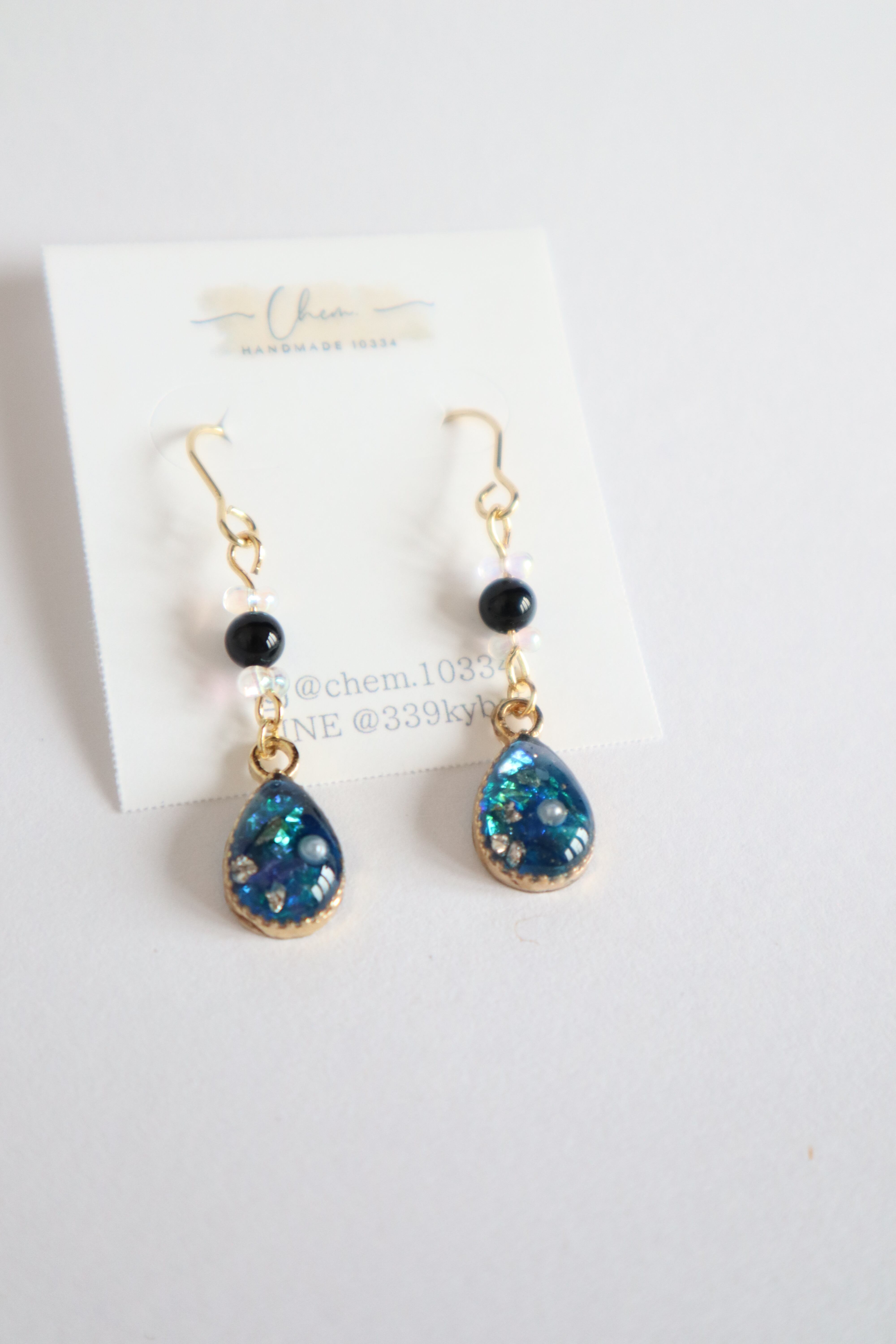 雫型【ホタルガラス風レジン×オニキス】ゴールドイヤリング・ピアス (金属アレルギー対応)