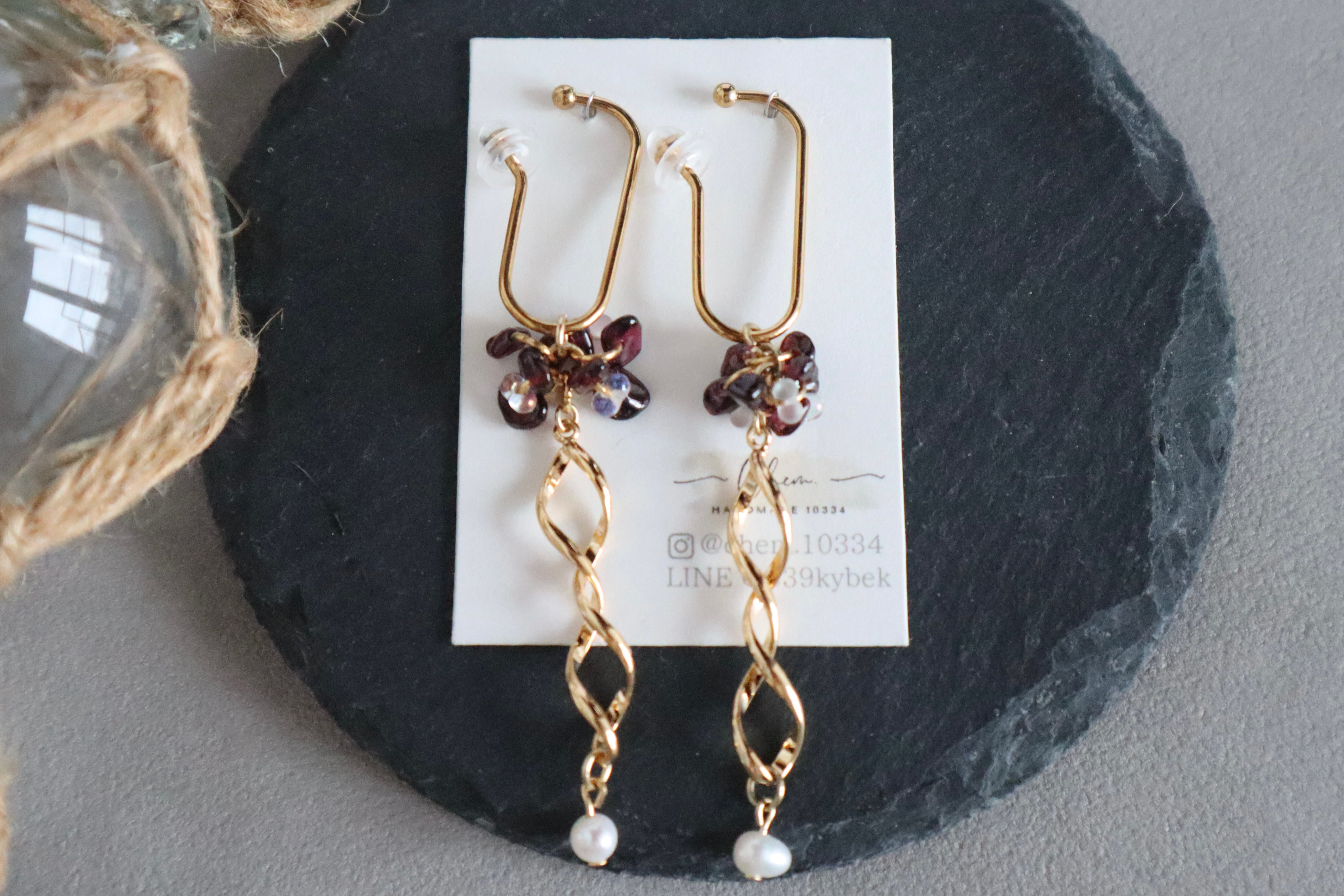 <痛くない> 『Amulet U』イヤーカフSET ツイストゴールド【ガーネット×淡水パール】(金属アレルギー対応) ec01G