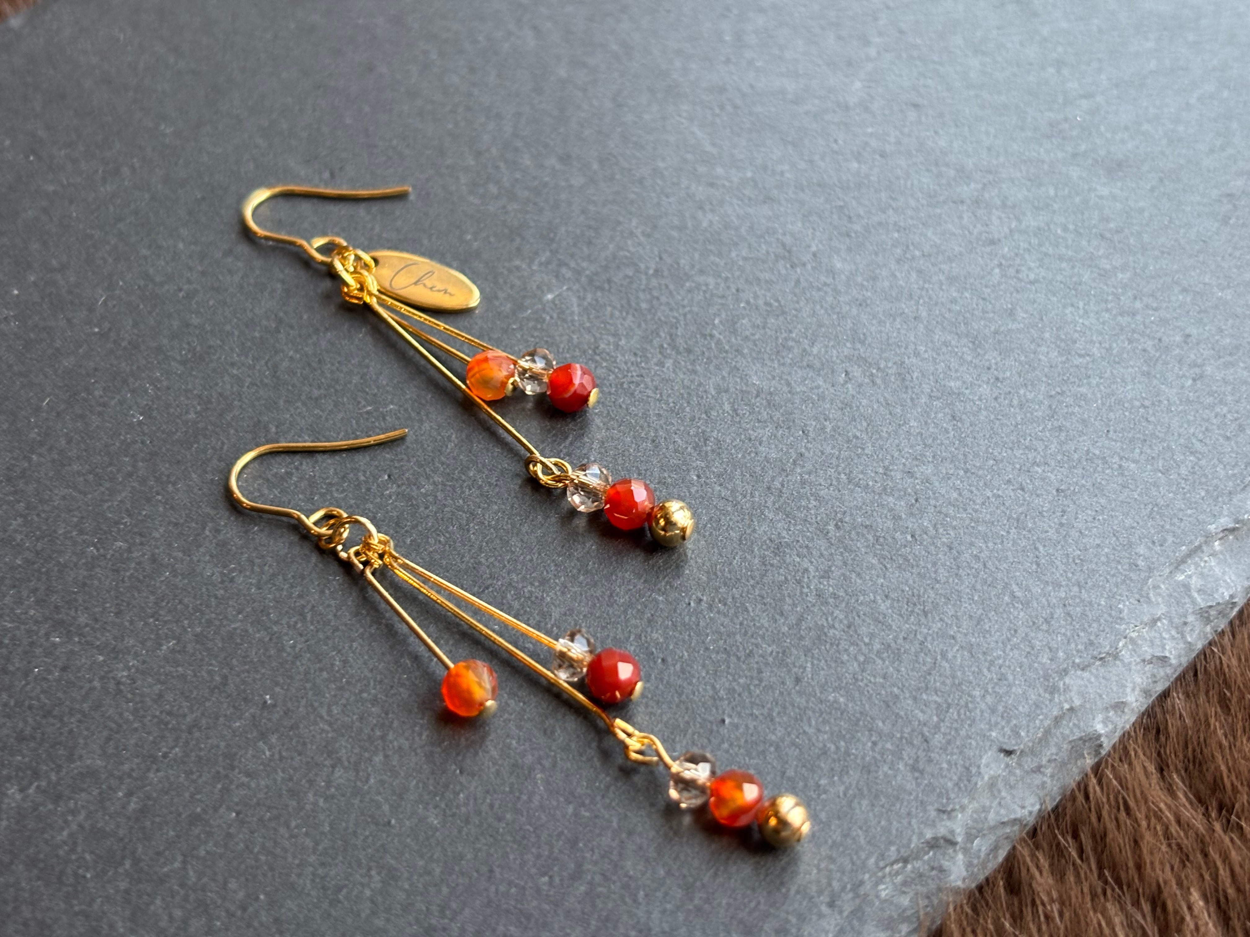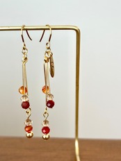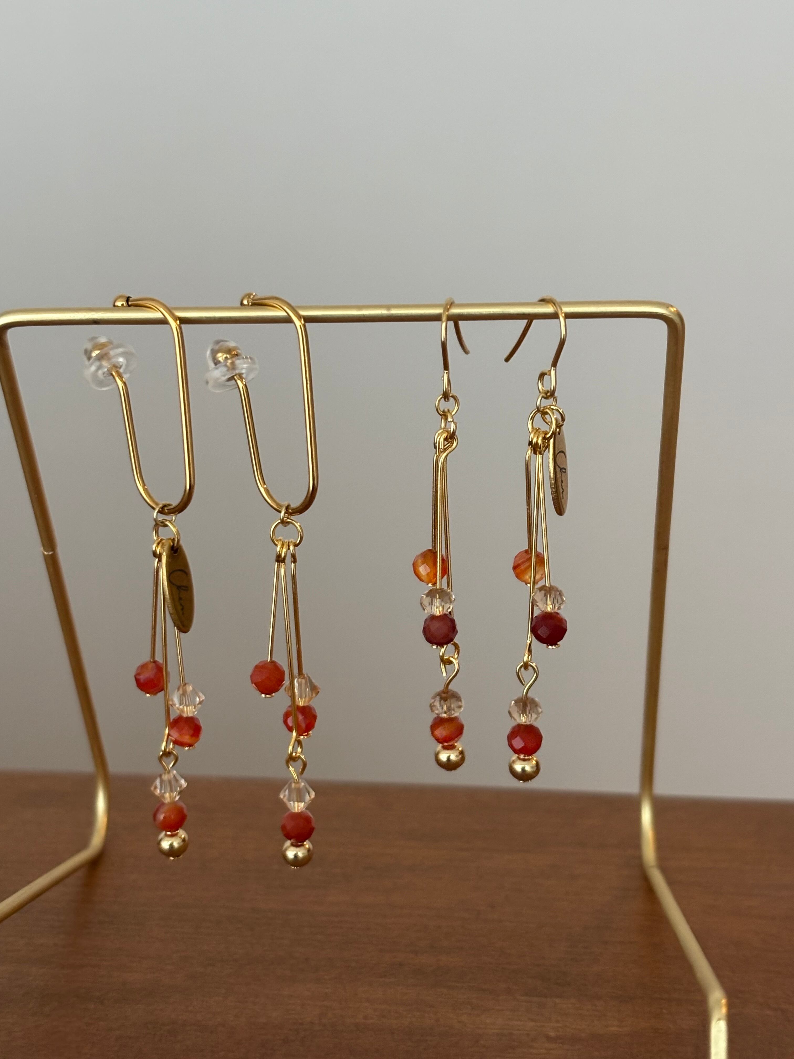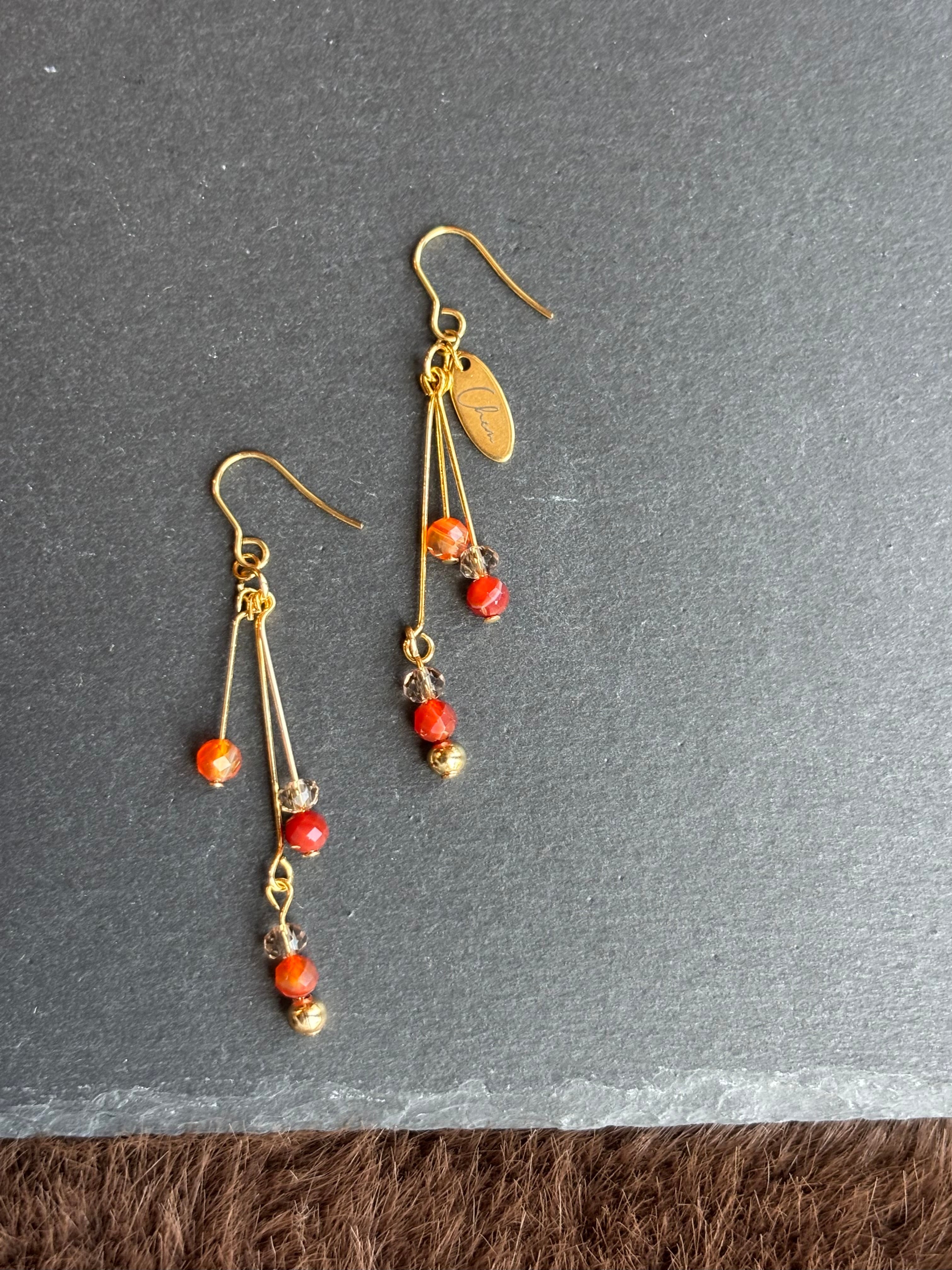 秋カラーのカーネリアンサードオニキスを使用した、動くたびに重なり揺れるレイヤーデザインのピアス。