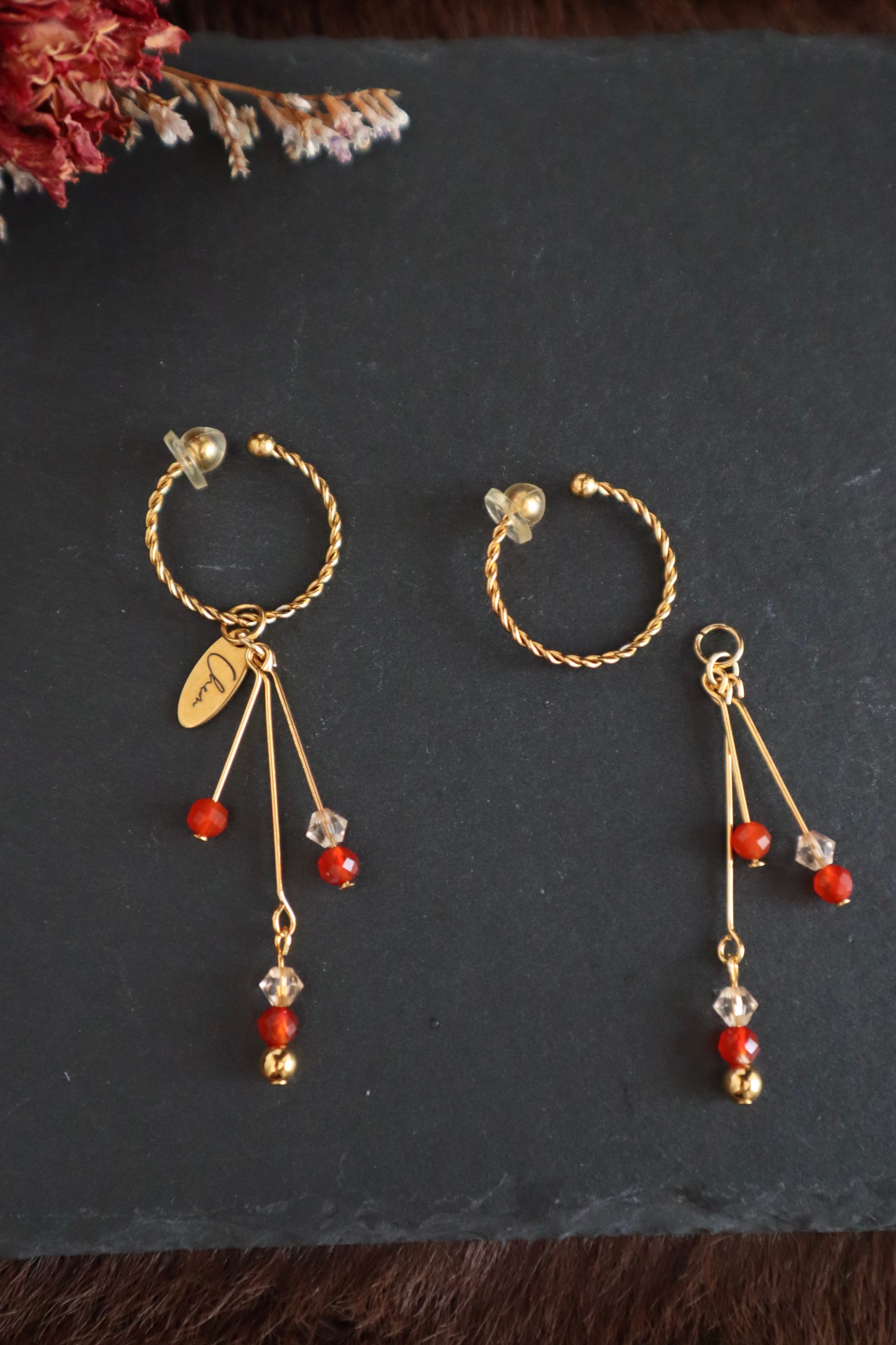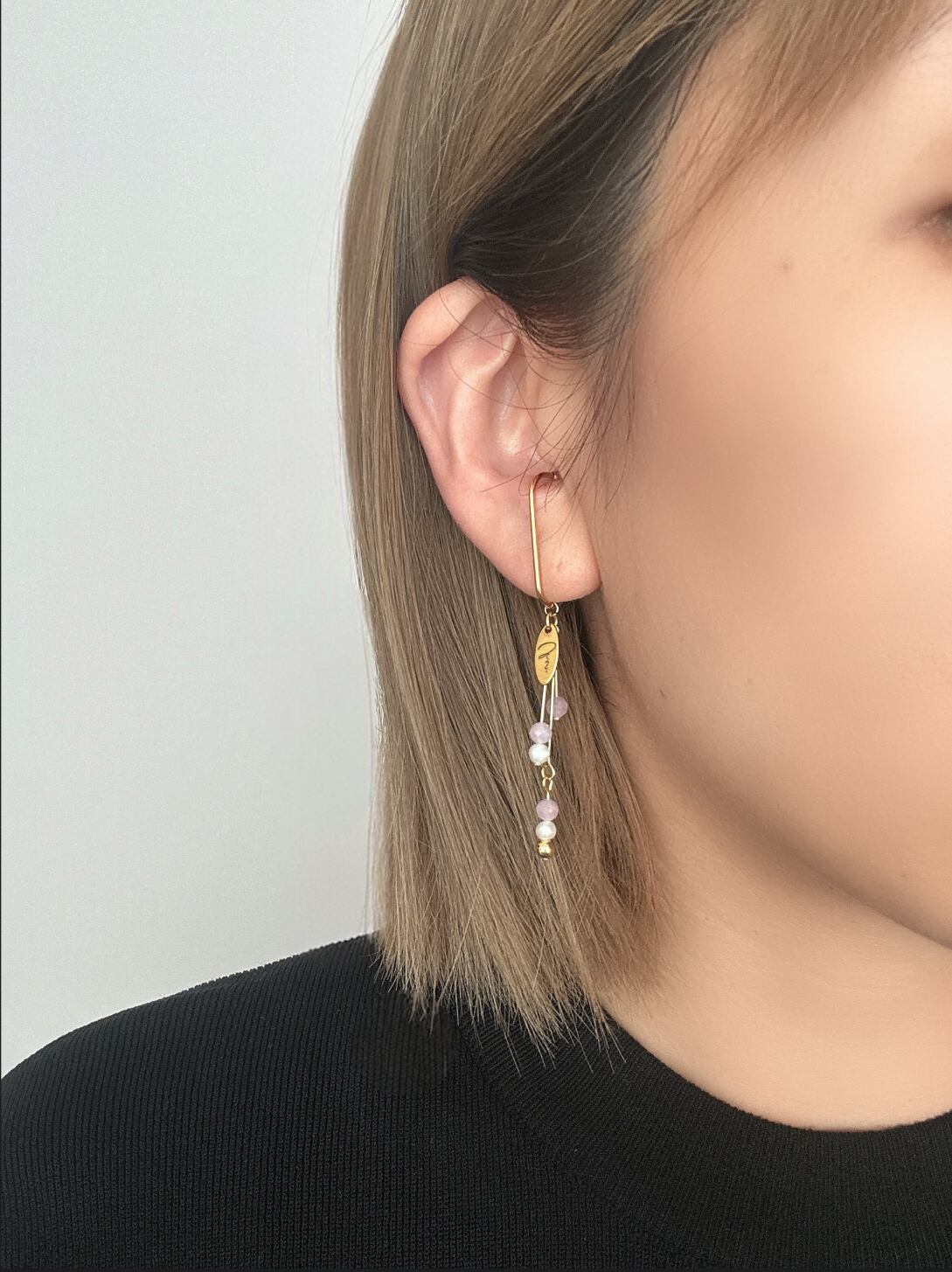 クンツァイトと淡水パールを使用した、動くたびに重なり揺れるレイヤーデザインの両耳用イヤーカフ。