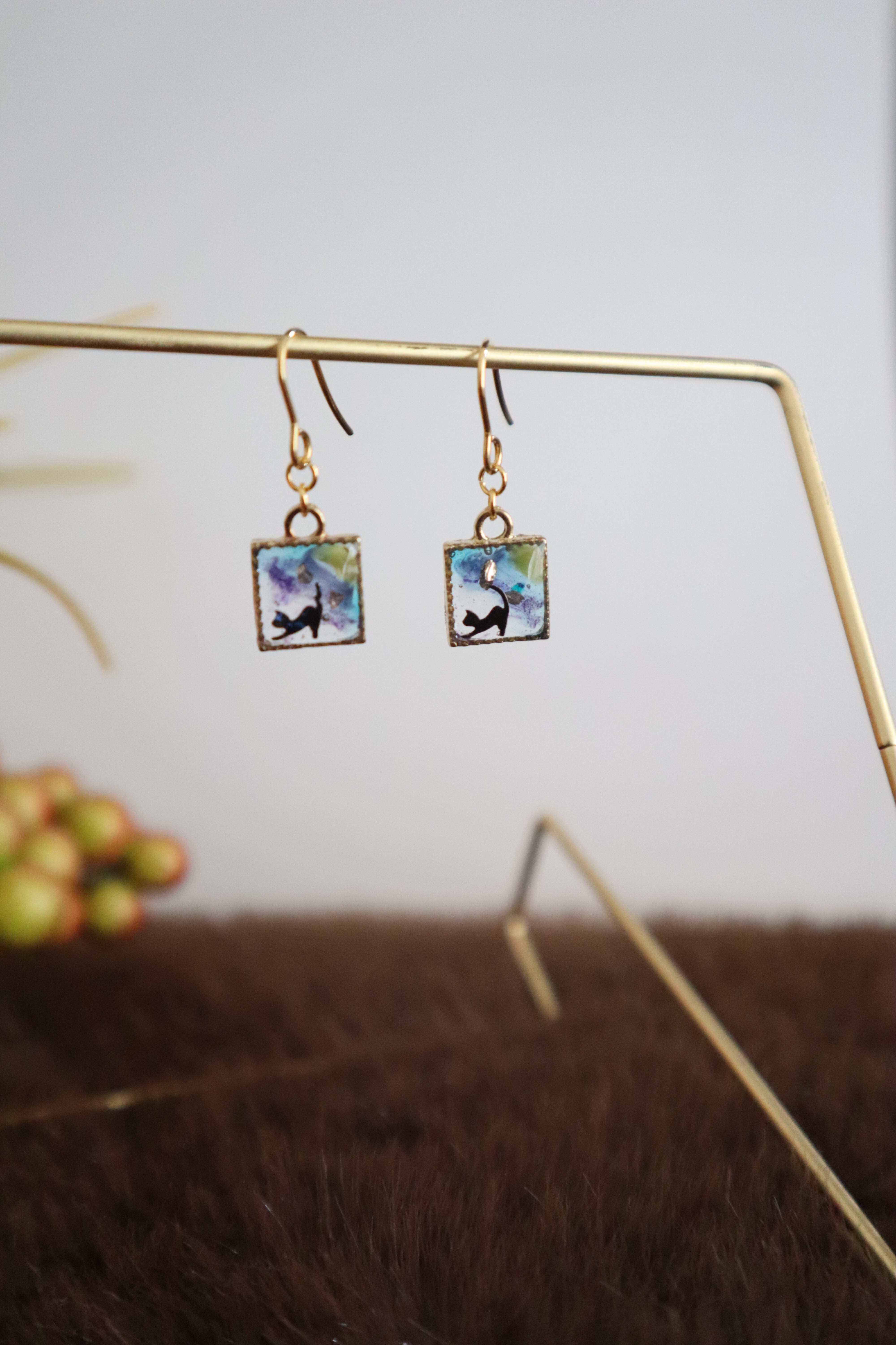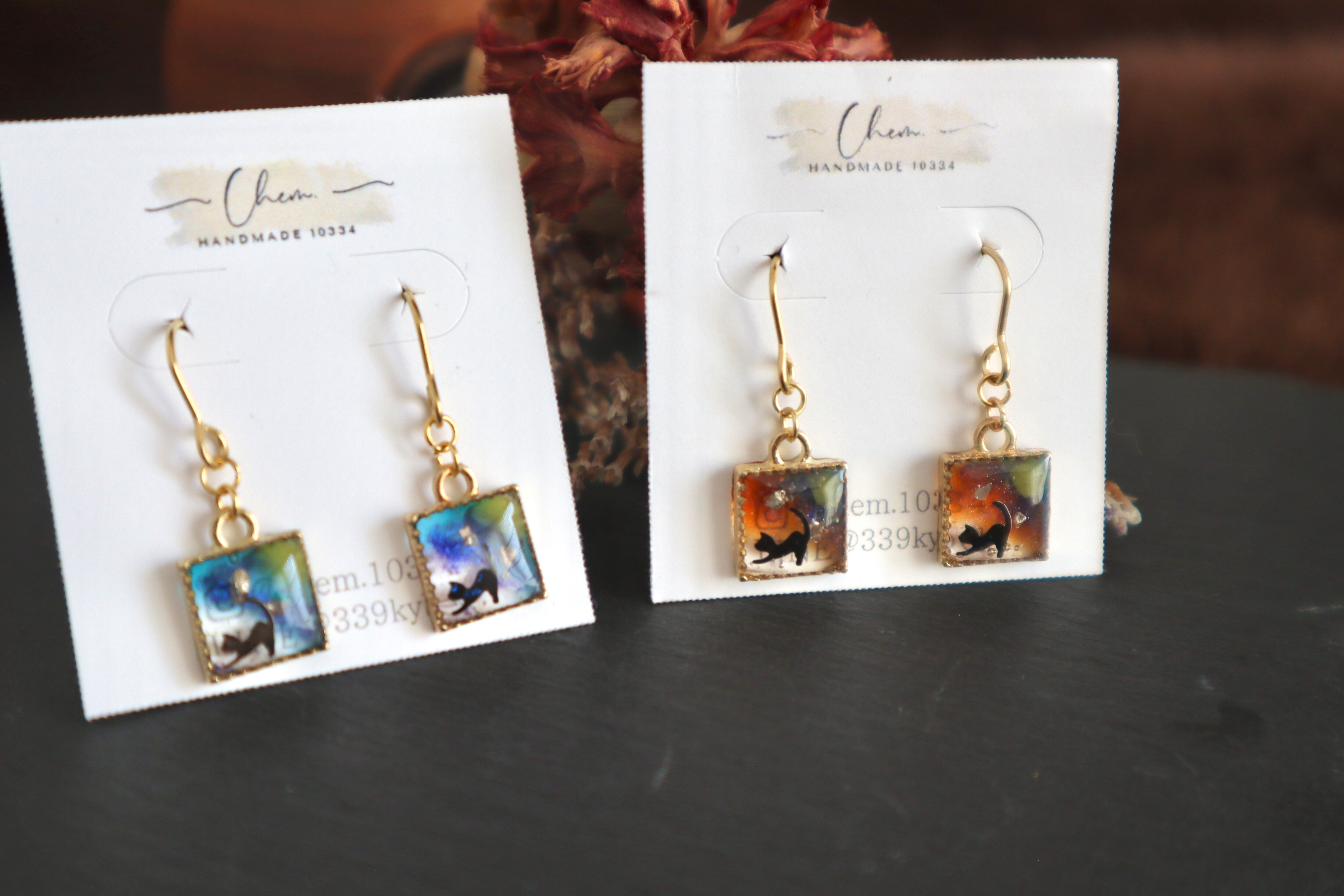 レジンスクエア 夜空 黒ネコ ハロウィン イヤリング・ピアス
