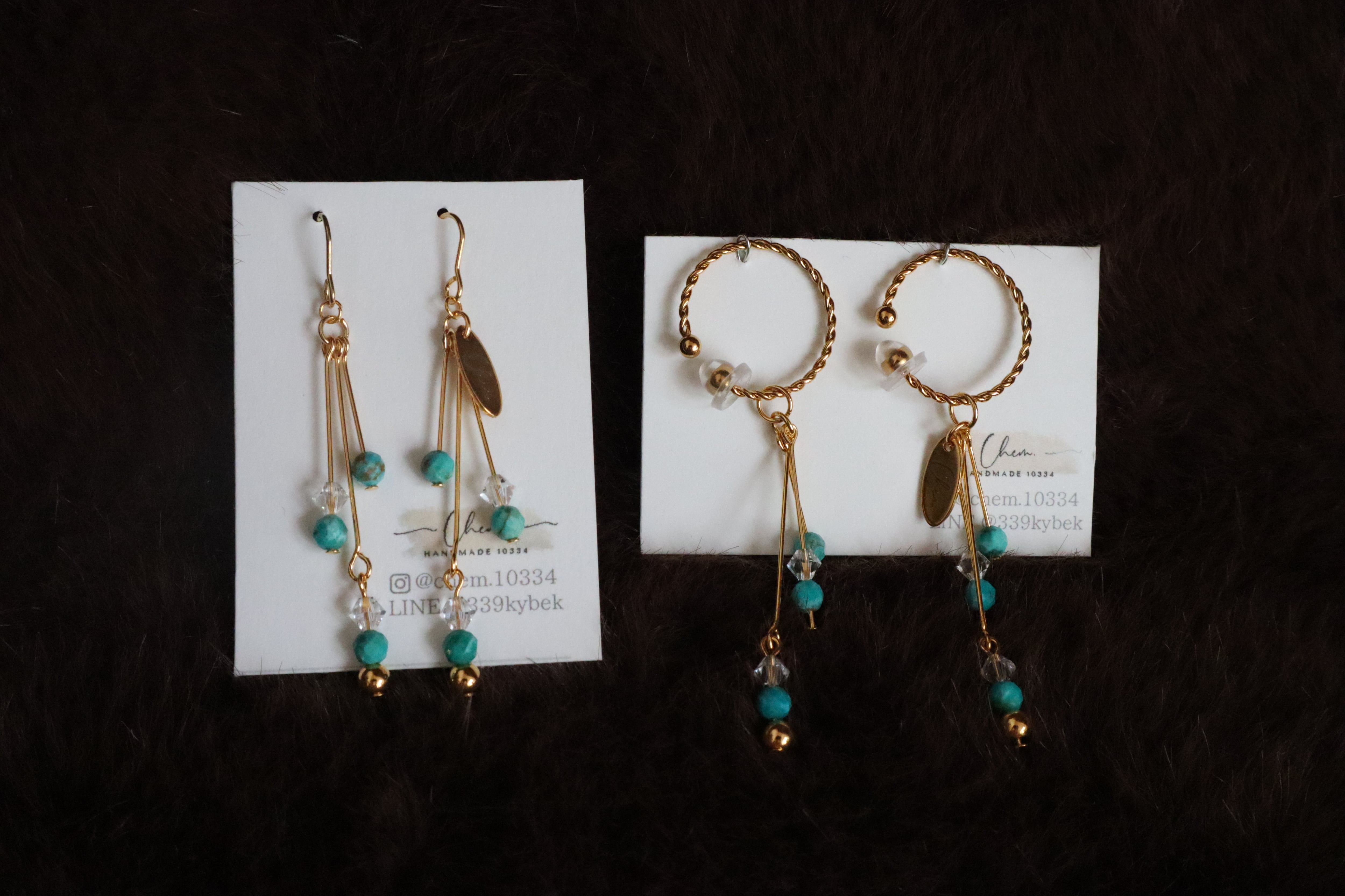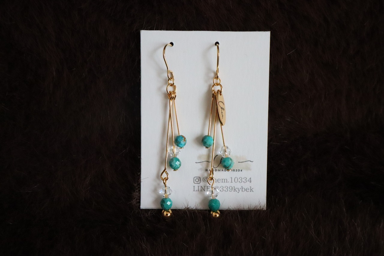 ターコイズ(トルコ石)を使用した、動くたびに重なり揺れるレイヤーデザインのピアス。