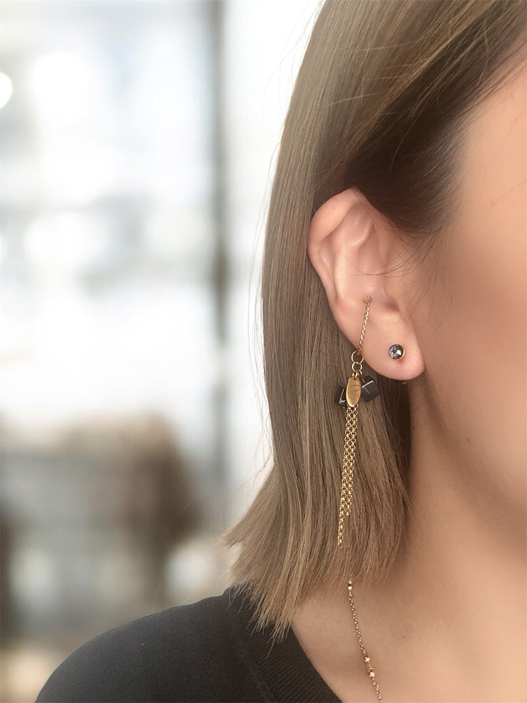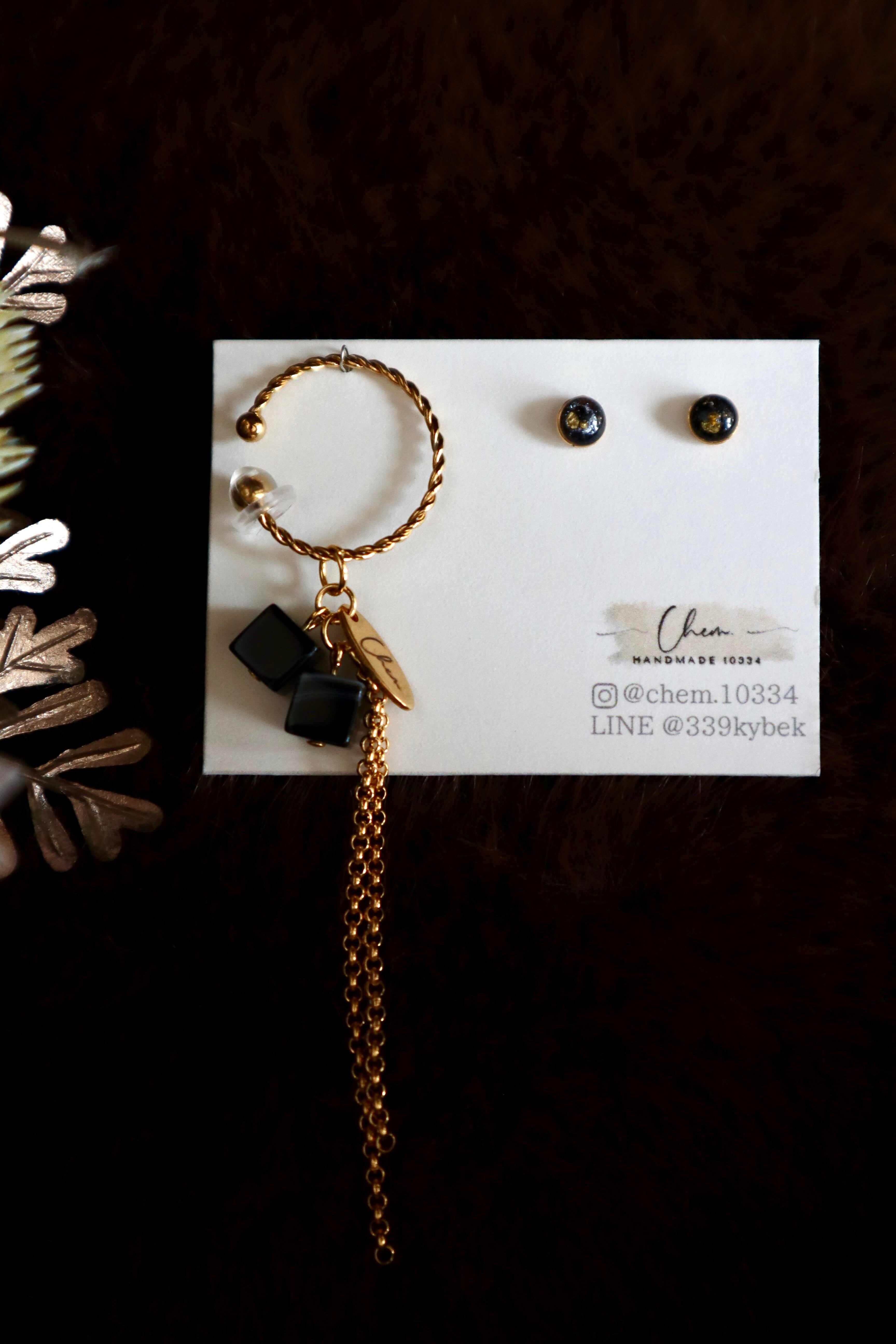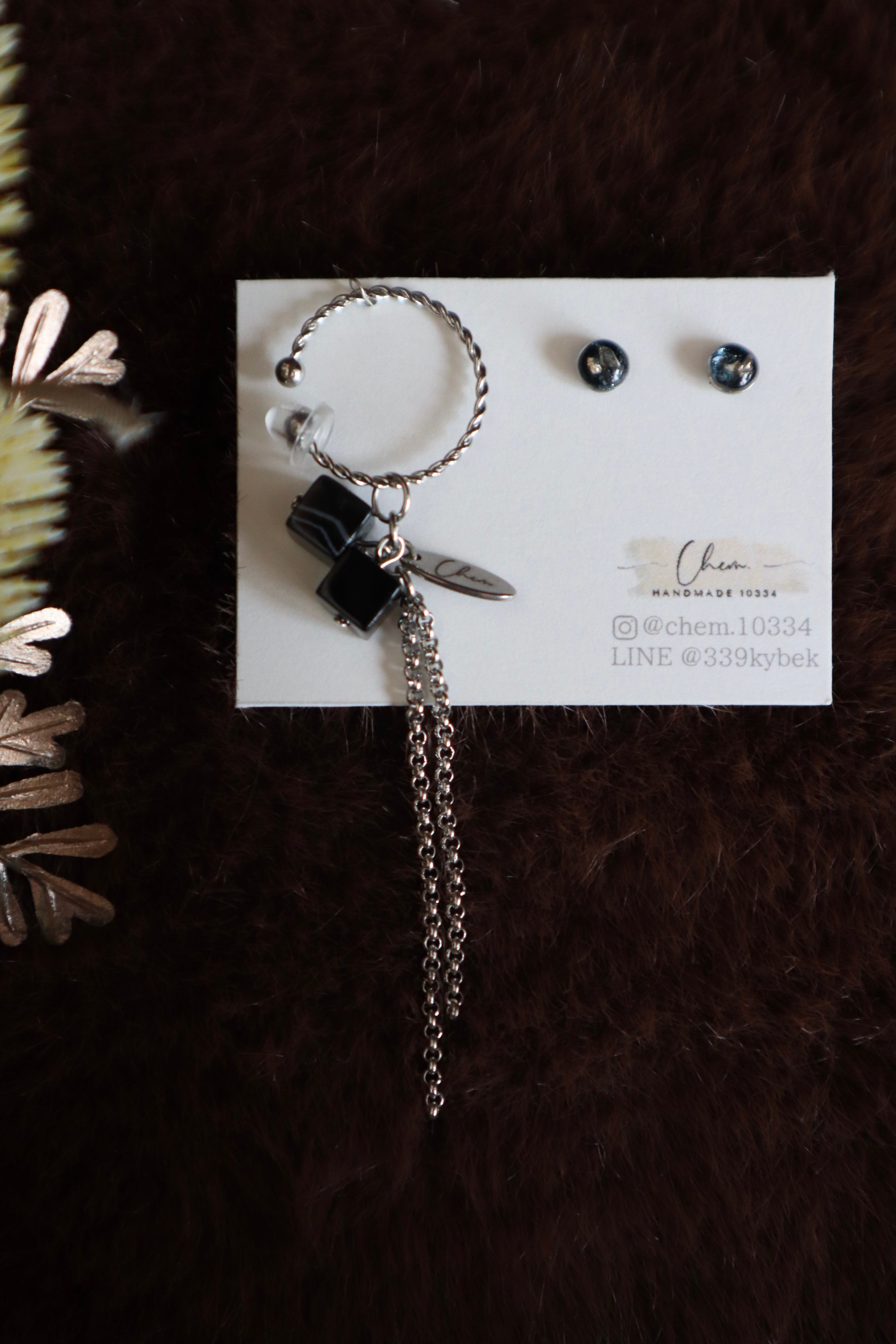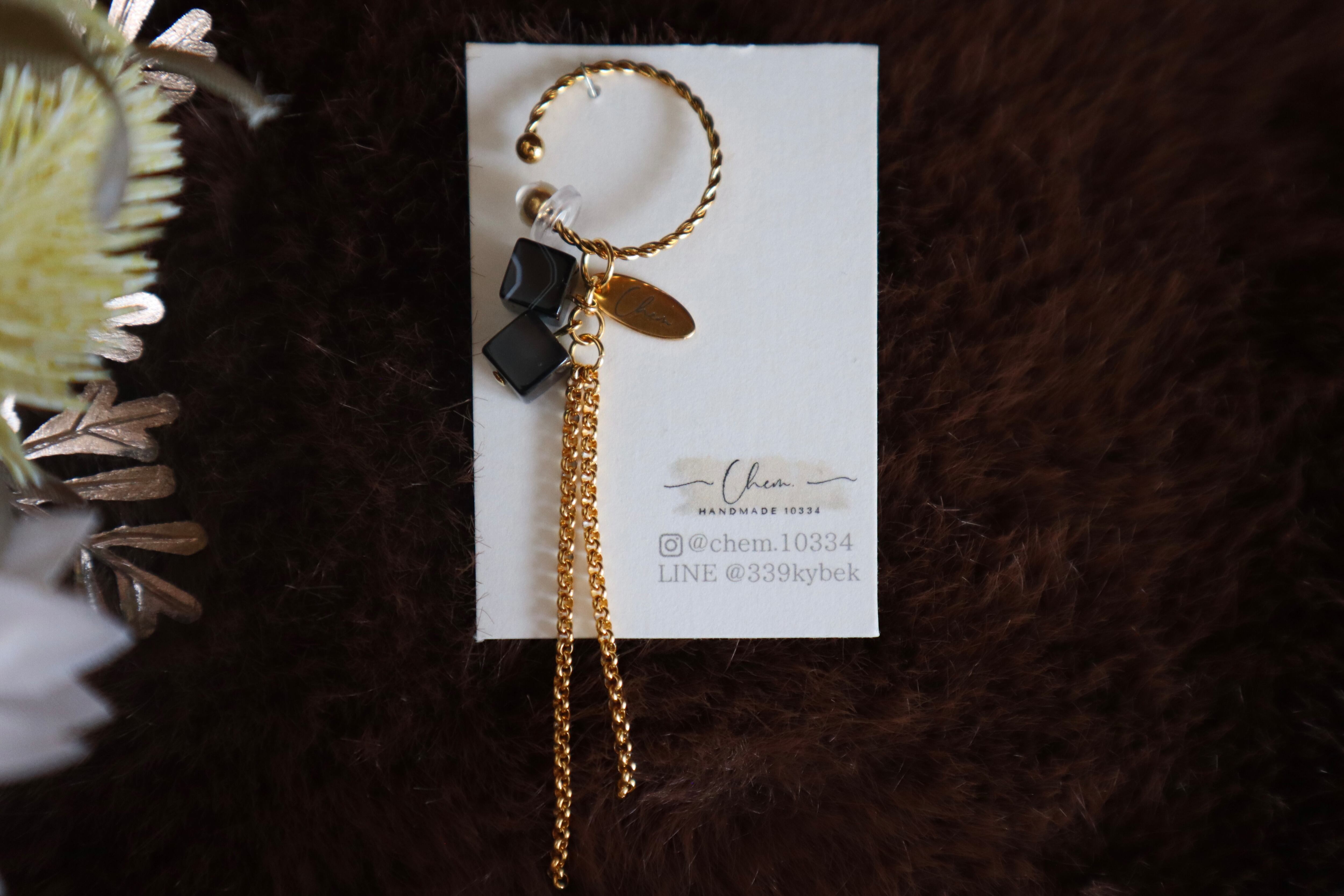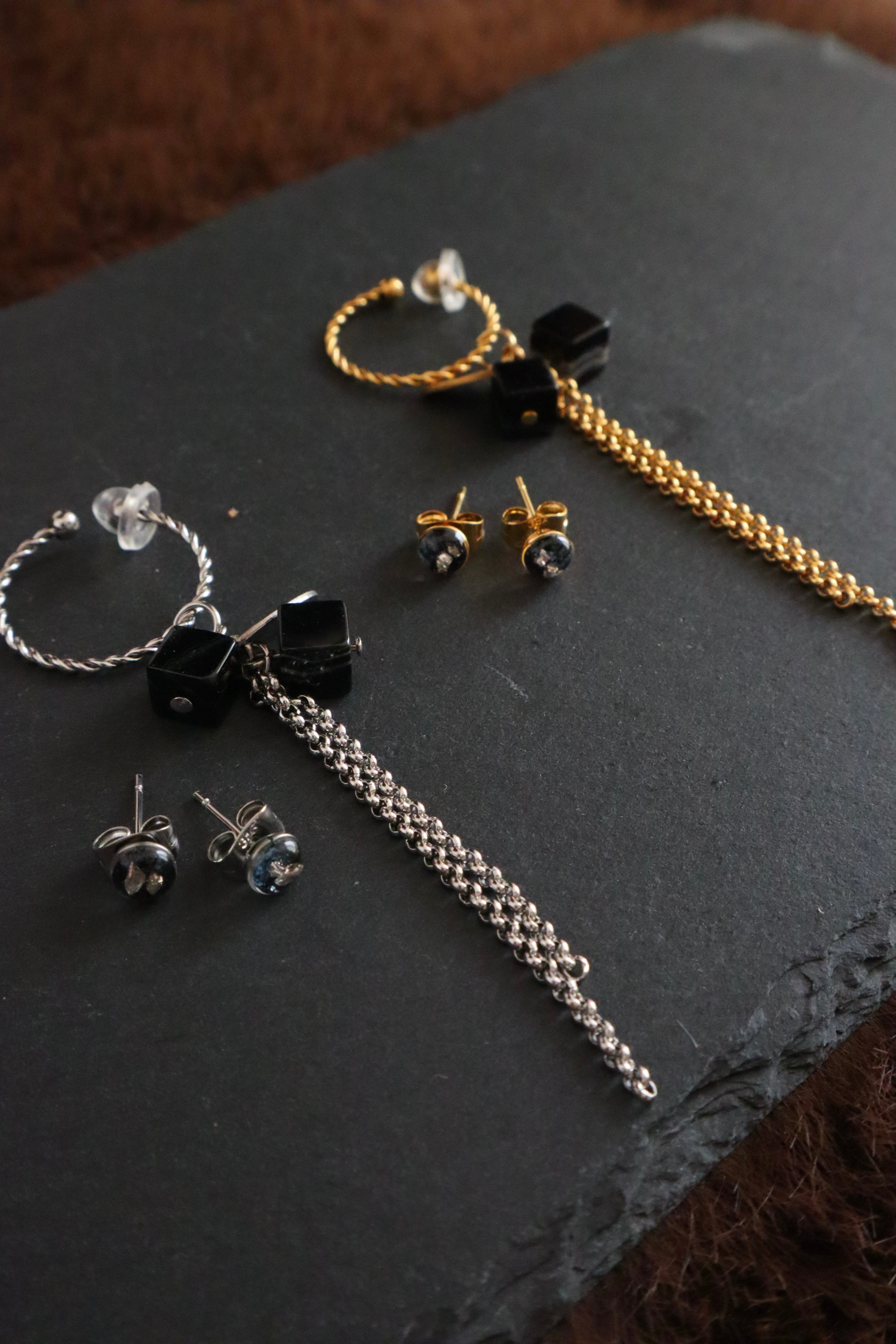 キューブ型のオニキス使用した、動くたびに揺れるイヤーカフと、耳元を彩る一粒ピアスorイヤリングの重ね付けSET。(着画写真はイヤリングタイプになっております)