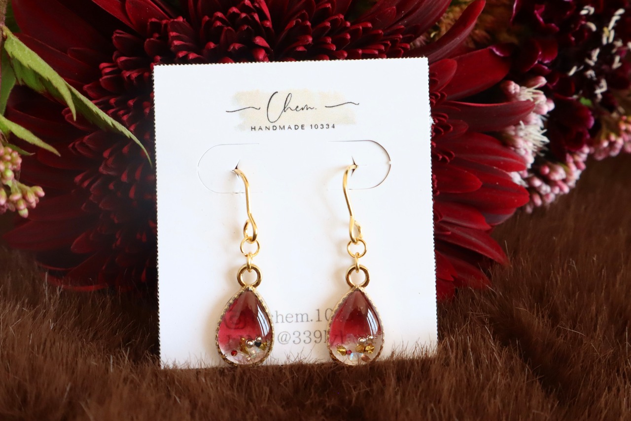 雫・レジン【ワインレッド】揺れるゴールドイヤリング・ピアス (金属アレルギー対応)