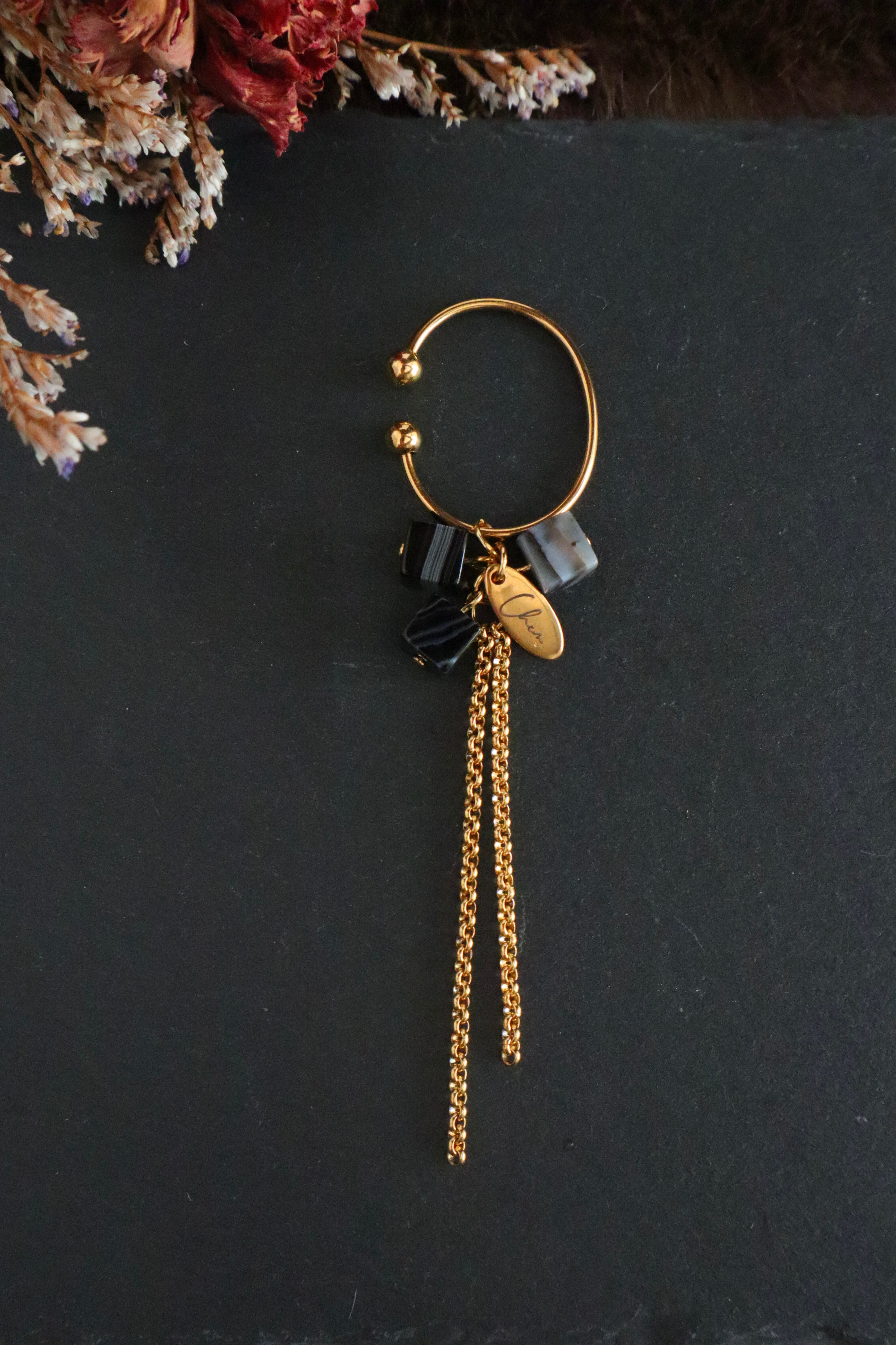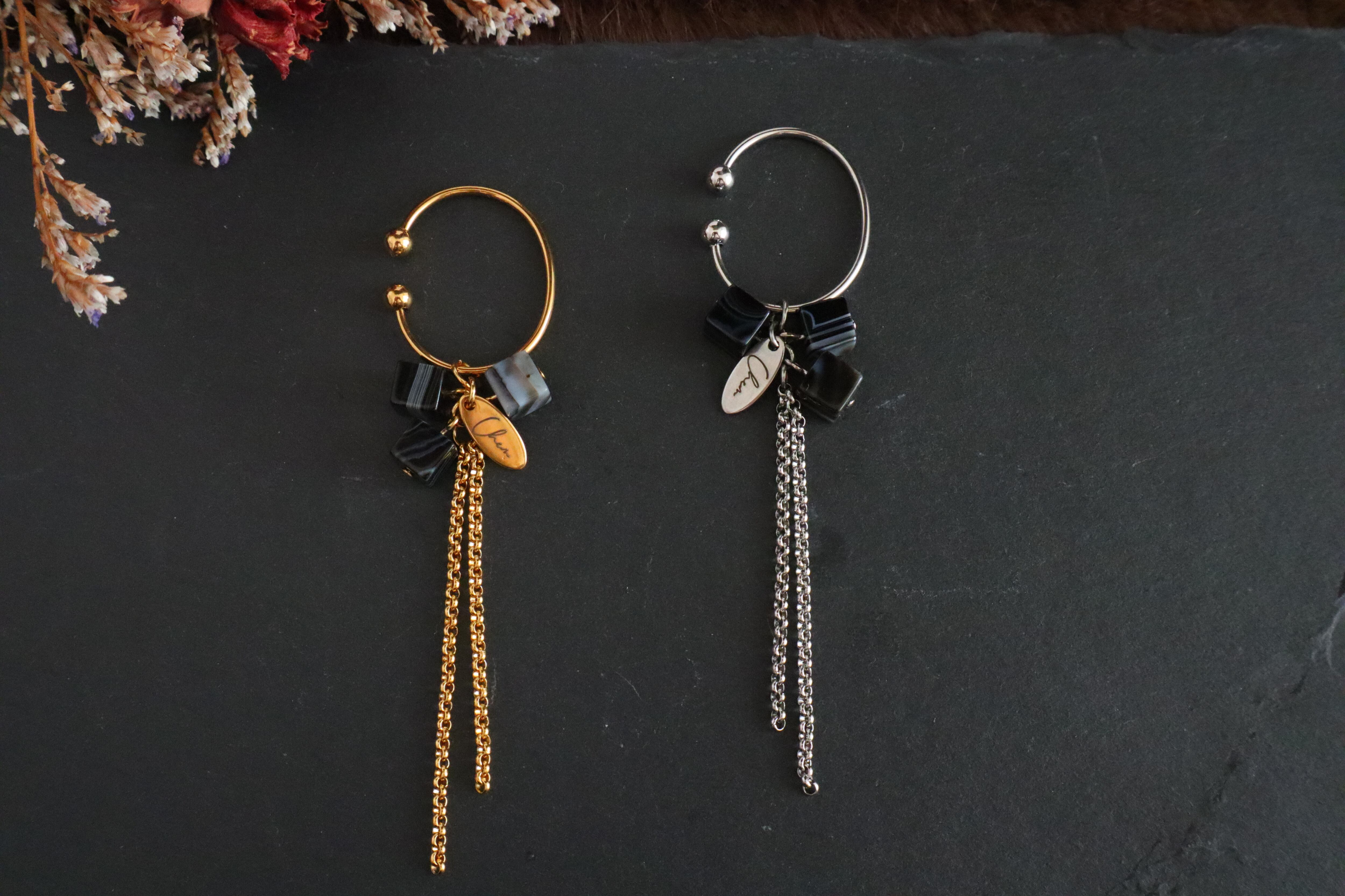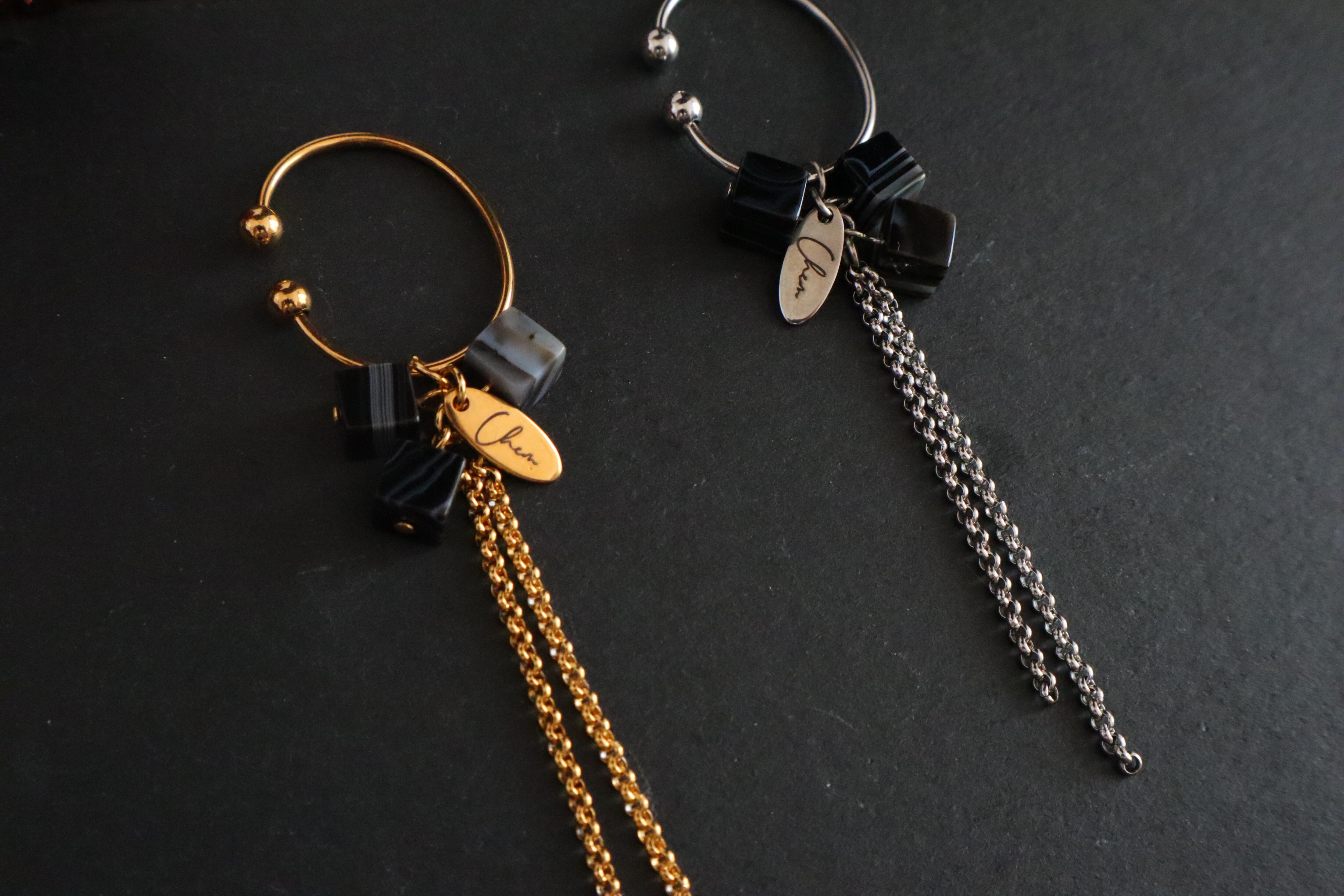 キューブ型のオニキス使用した、動くたびに揺れるイヤーカフ