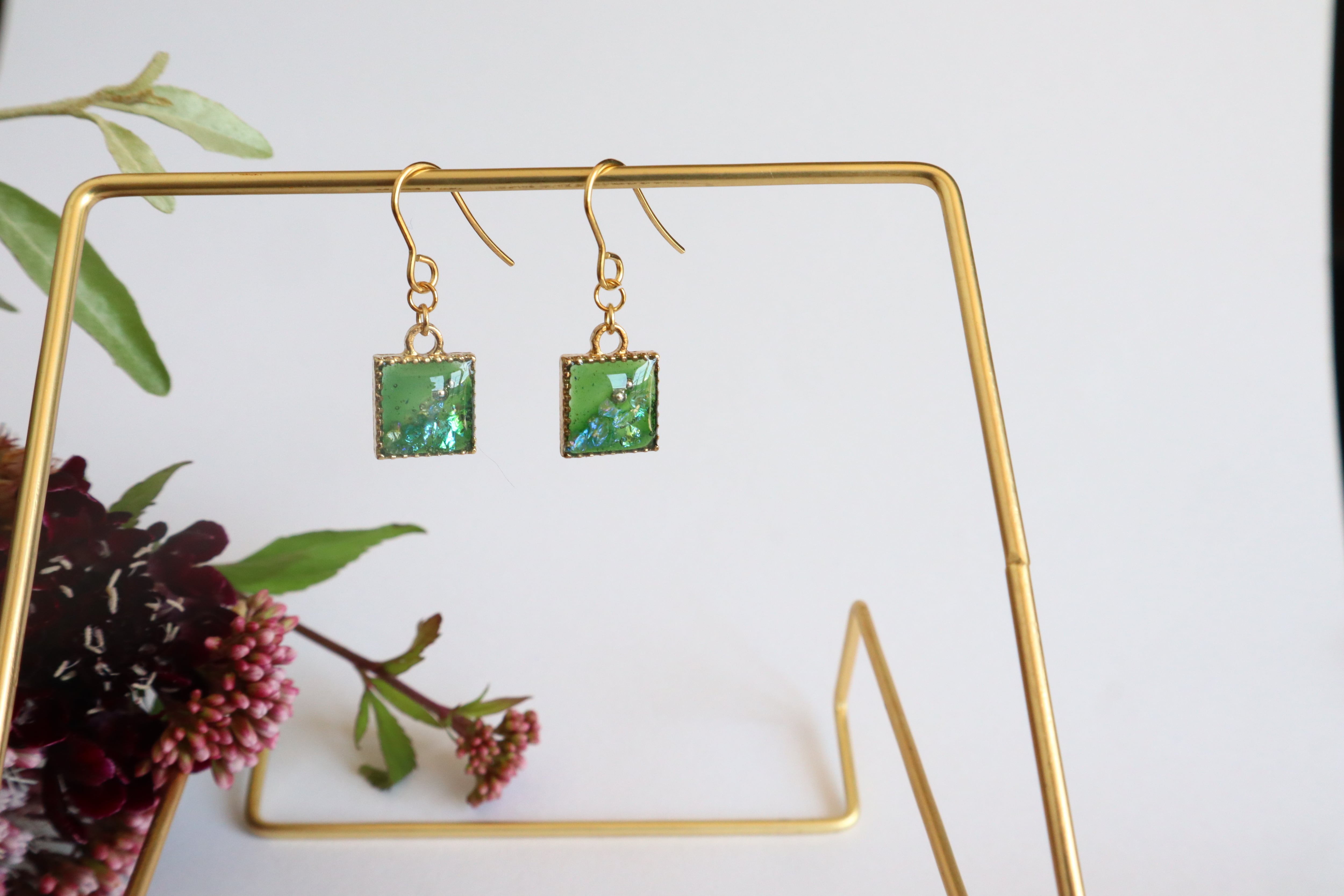 スクエア・レジン【グリーンオーロラ】揺れるゴールドイヤリング・ピアス (金属アレルギー対応)