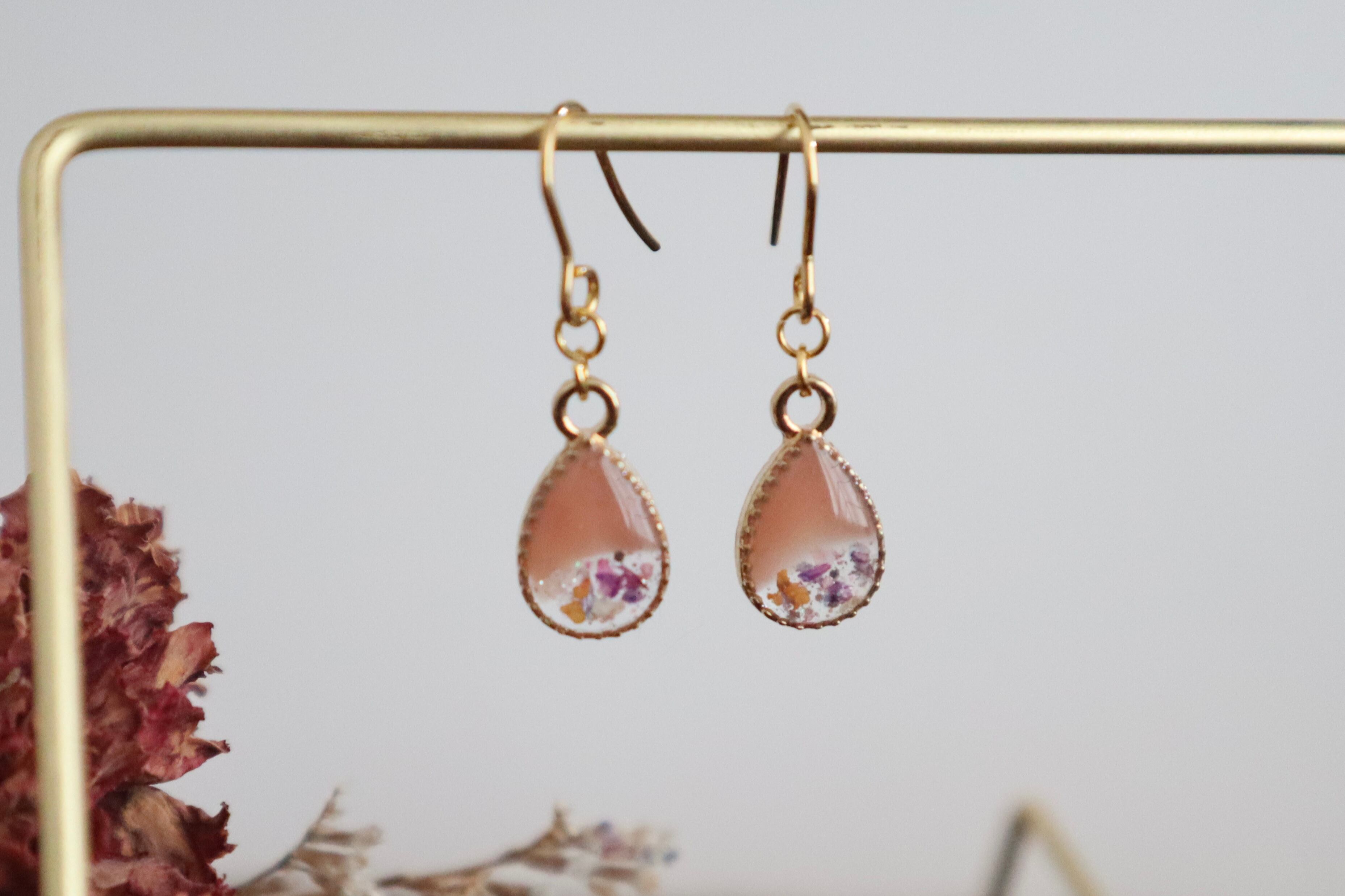 雫・レジン 【コーラルオレンジ×ドライフラワー】くすみ 揺れるゴールドイヤリング・ピアス (金属アレルギー対応)