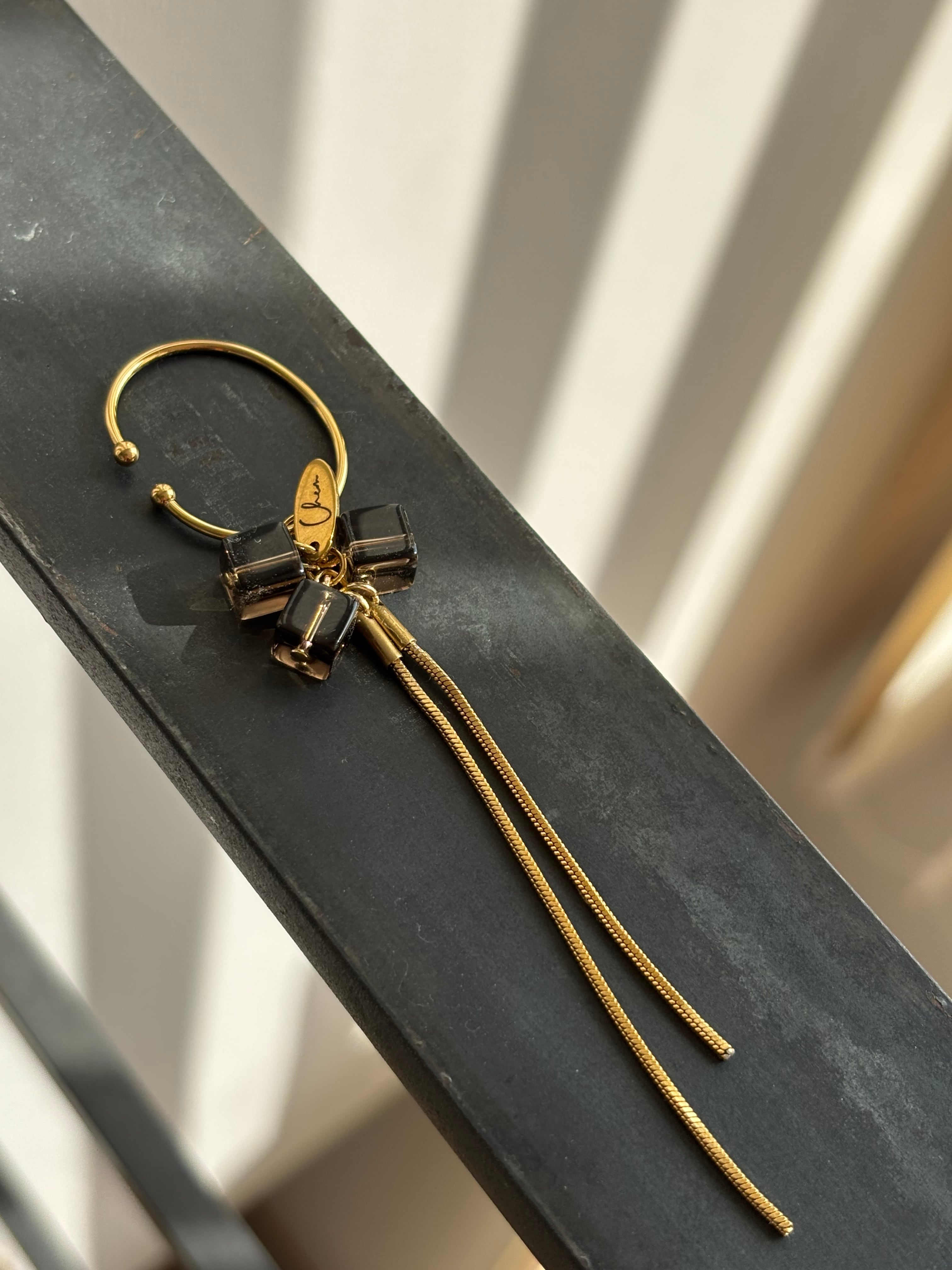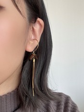 キューブ型のスモーキークォーツを使用した、動くたびに揺れるイヤーカフ