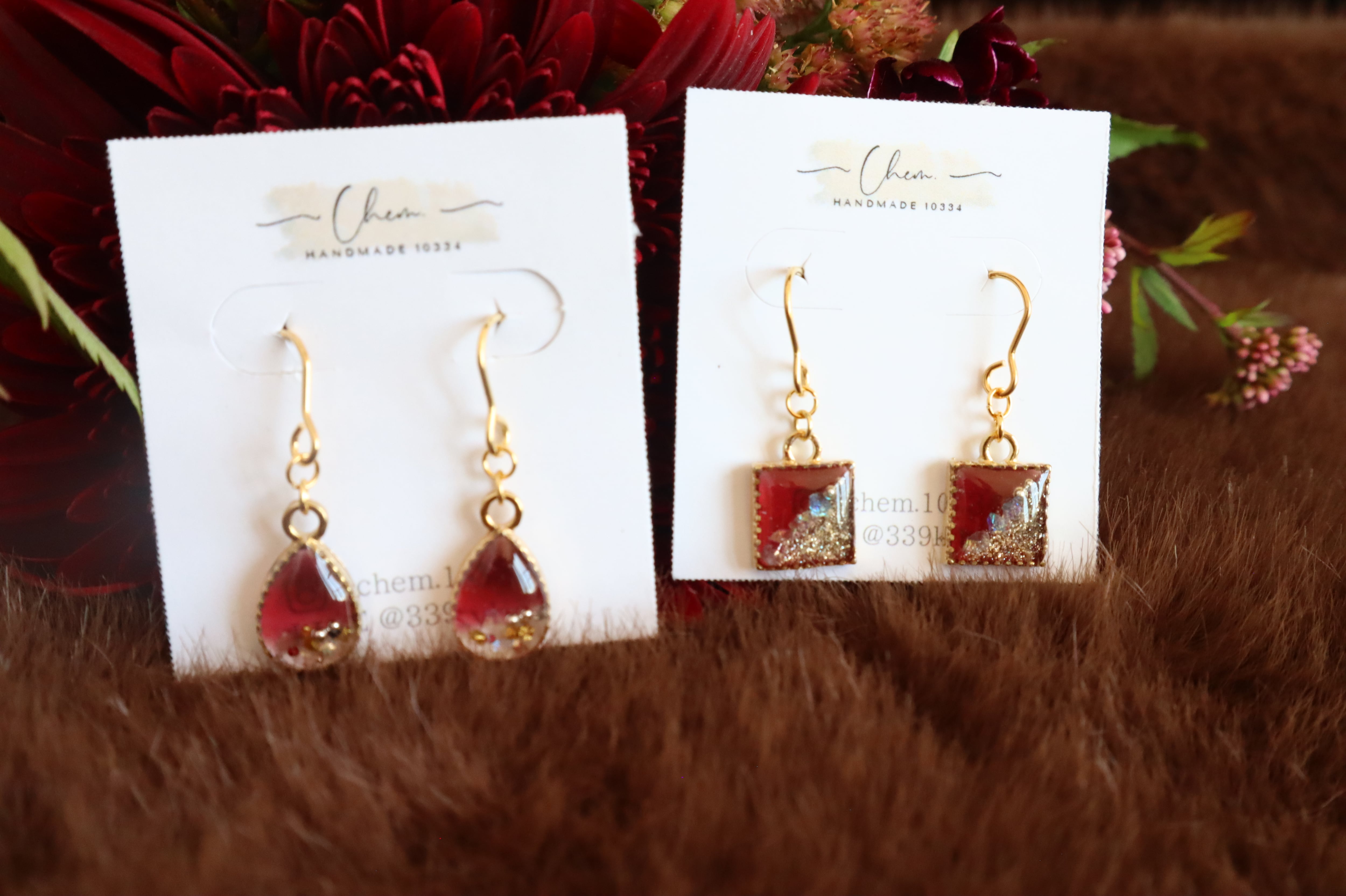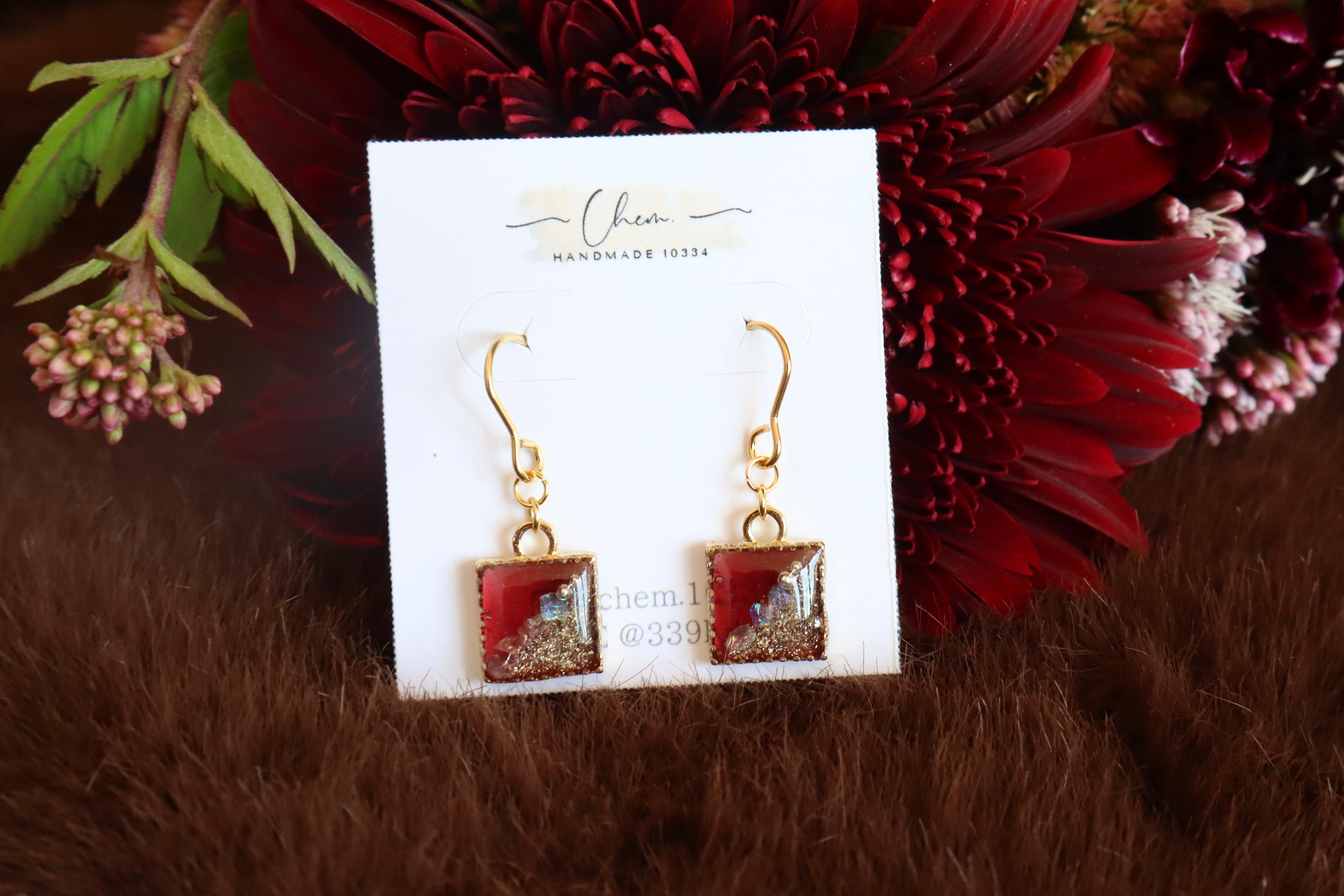 スクエア・レジン【ワインレッド】揺れるゴールドイヤリング・ピアス (金属アレルギー対応)