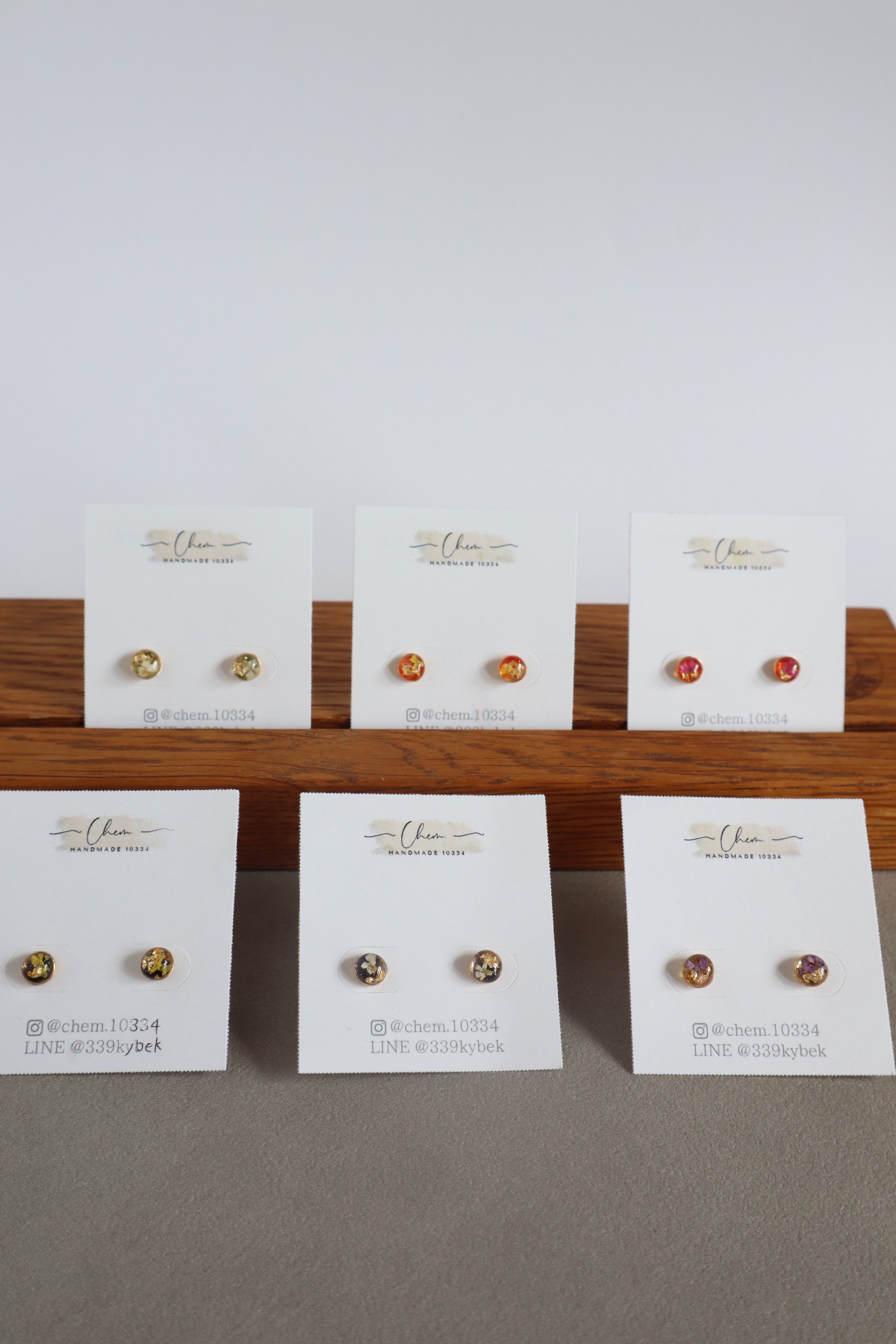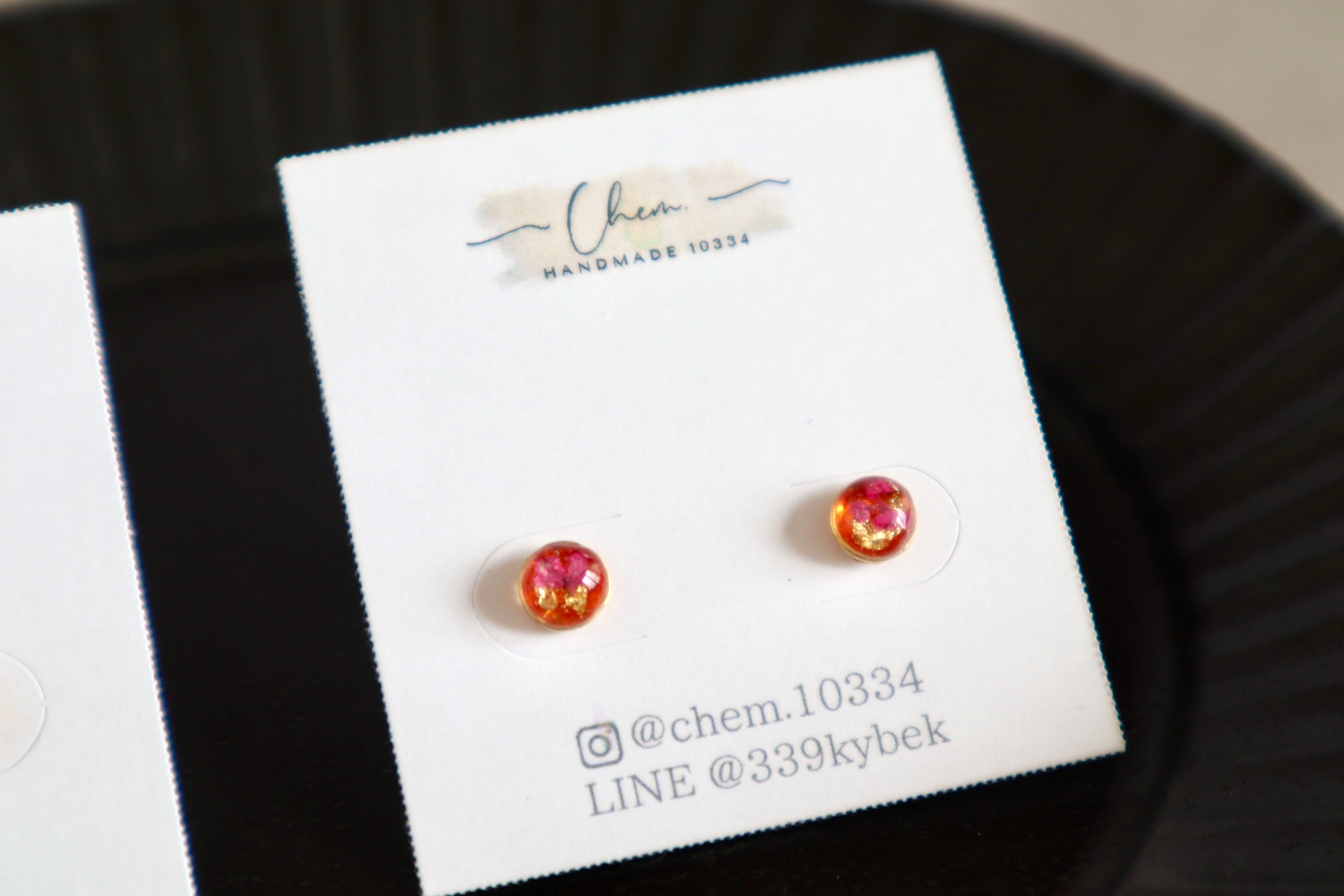 オレンジの一粒ピアスにピンクのドライフラワーと金箔風パーツを詰め込みました。